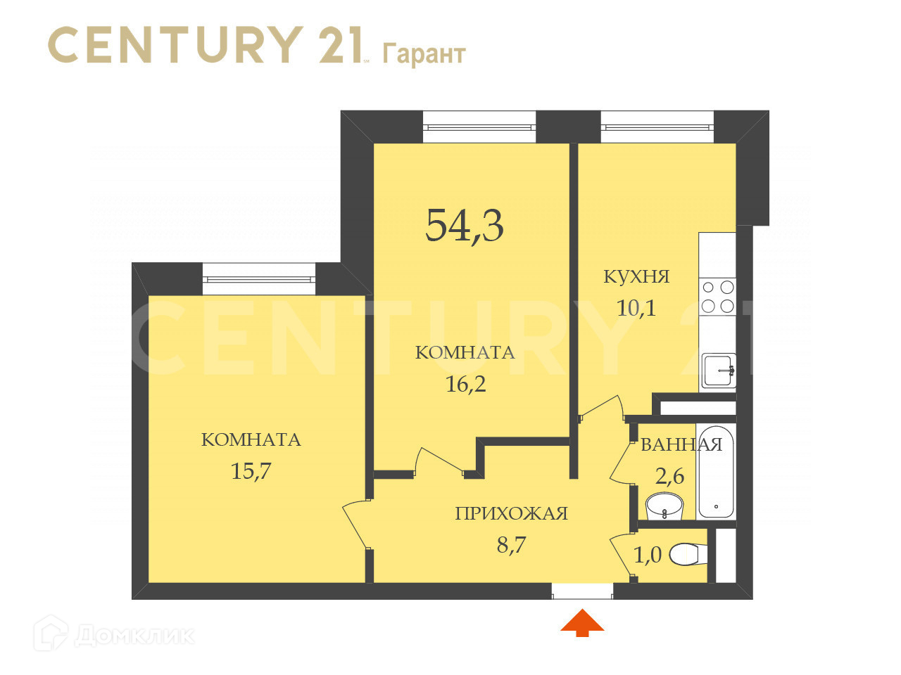 Общая площадь 54.3 м2