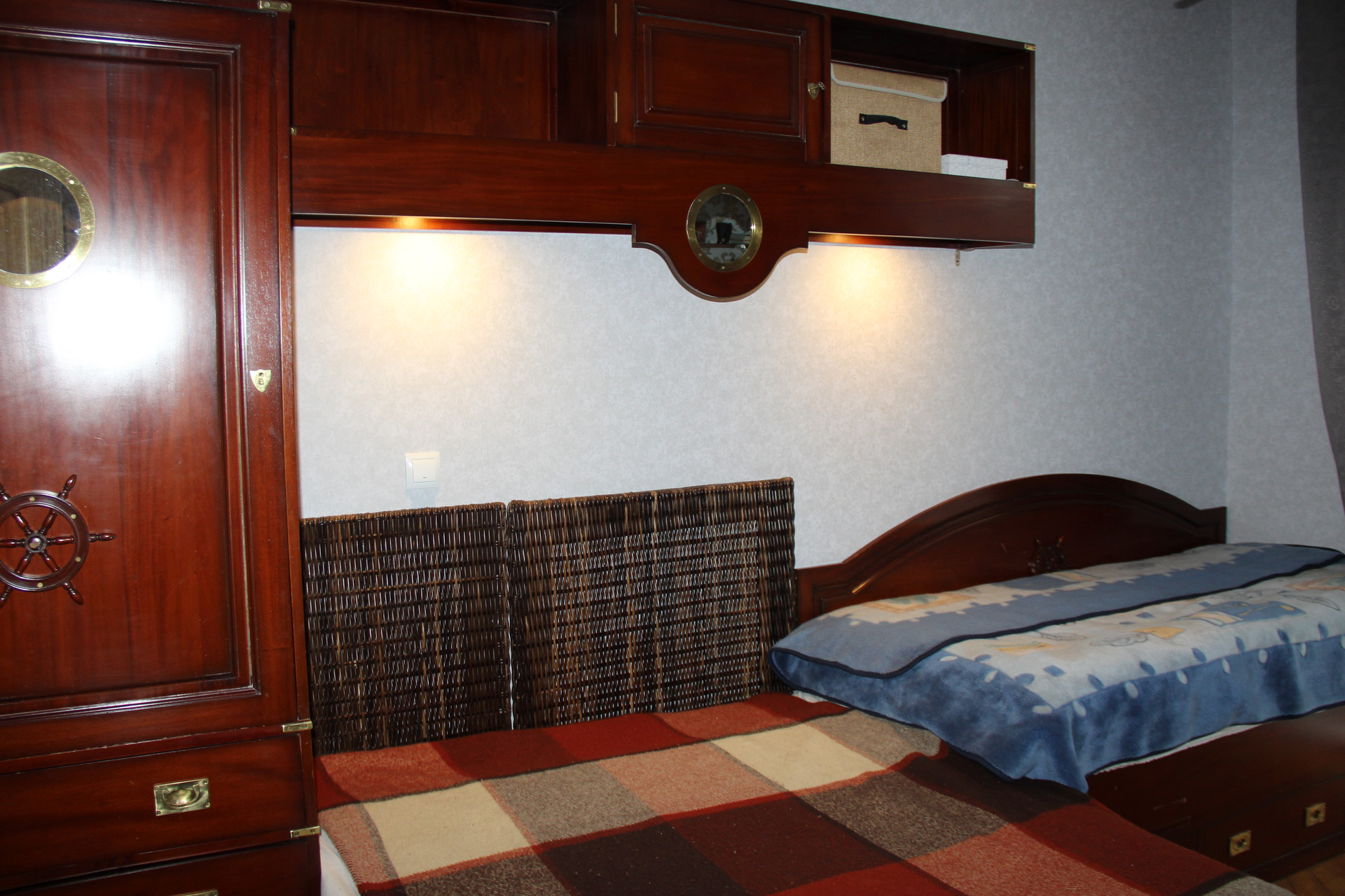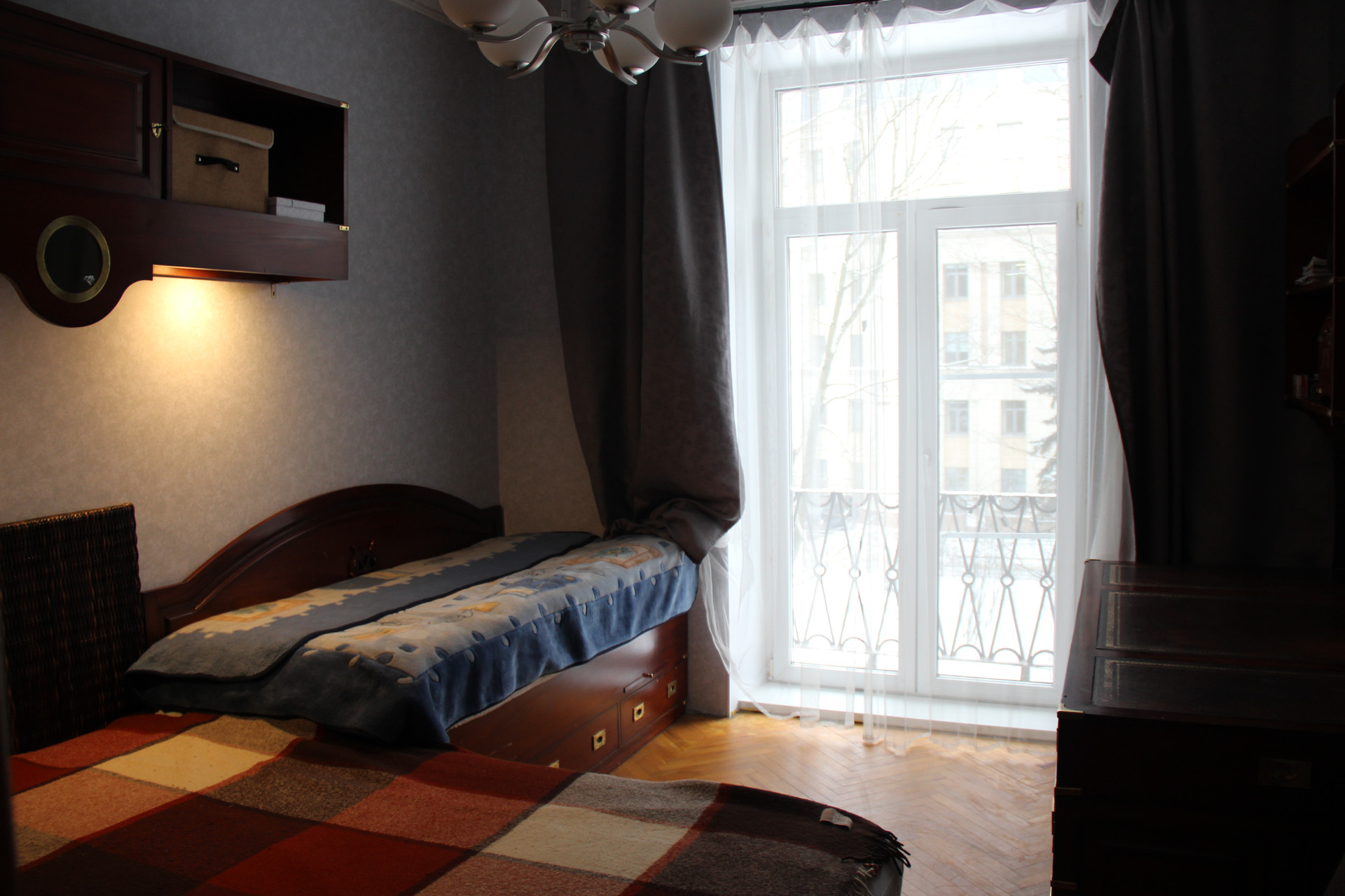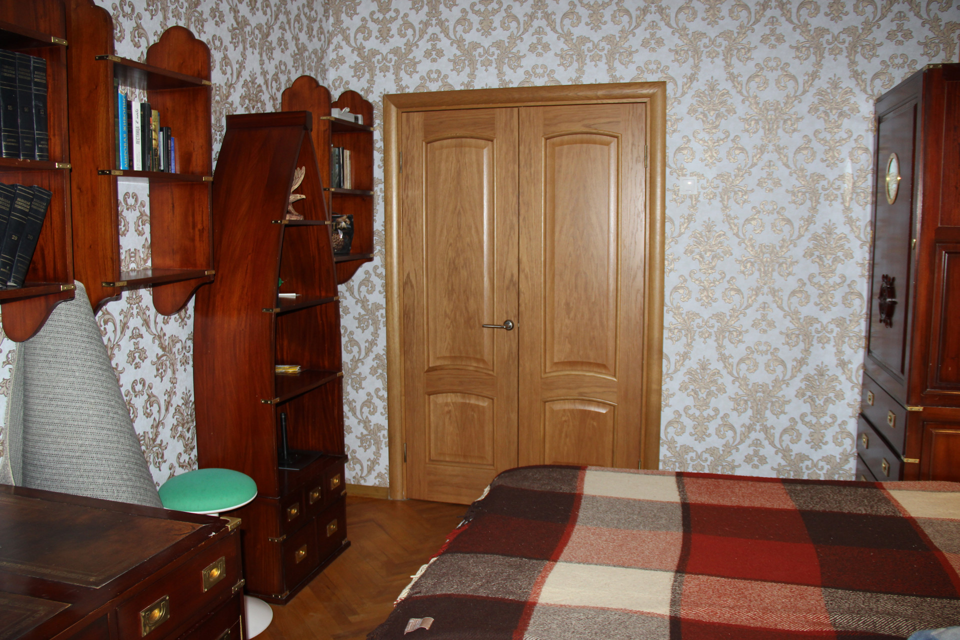 В комнате 14 м2 находится 1,5 спальная и 1 спальная кровати, шкаф и письменный стол (под старину). В комнате 19 м2 находится 2-х спальная кровать и угловой раскладной, большой диван. ЖК телевизор.