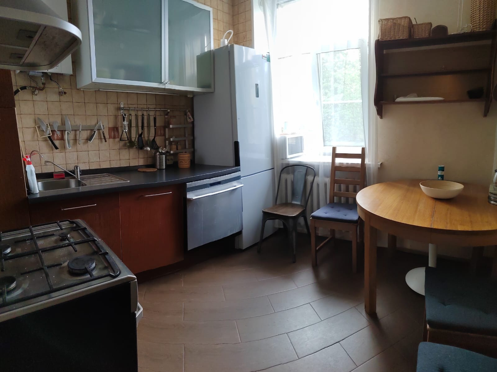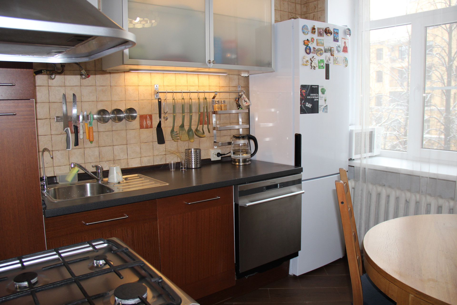 Кухня оборудована всей бытовой техникой и кухонными принадлежностями, есть посудомоечная машина и система фильтрации воды, микроволновая печь. Газовая колонка.