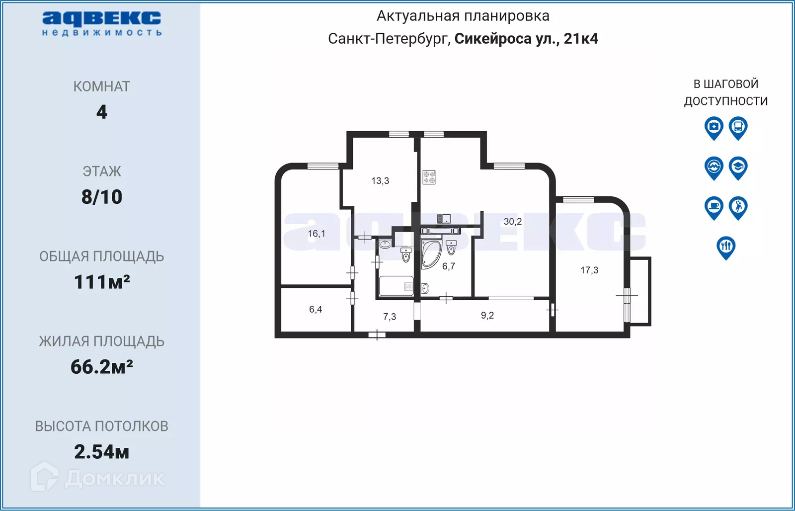 4-комнатная квартира, 111 м2, этаж 8 / 10, на продажу в Санкт-Петербурге, улица Сикейроса, 21к4