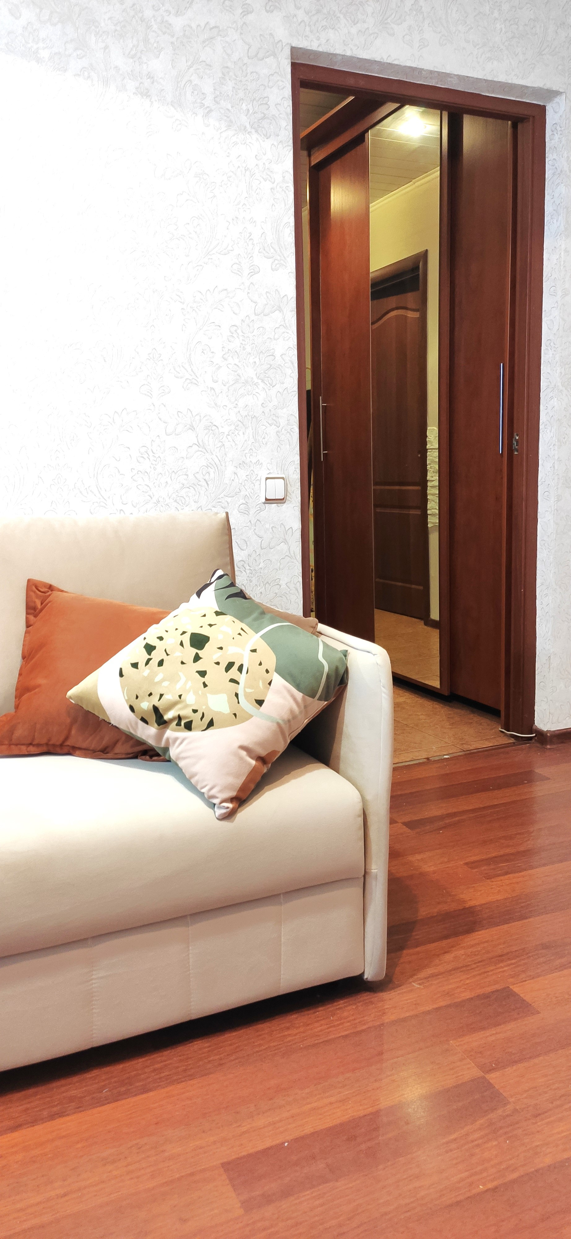 Общая площадь 46 м, изолированные комнаты 15 + 12, кухня 6,3 м, раздельный санузел, гардеробная с местом для стиральной машины. Высокий, но не последний этаж (8 из 9), шикарный вид на зеленую прогулочную зону. В ясную погоду виден купол Исакиевского собора! Приветливые соседи, чистая парадная, всего 4 квартиры на этаже.