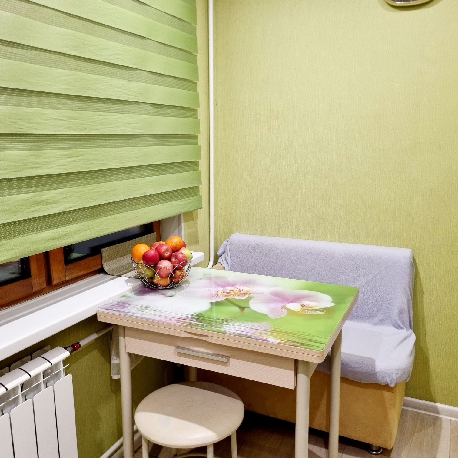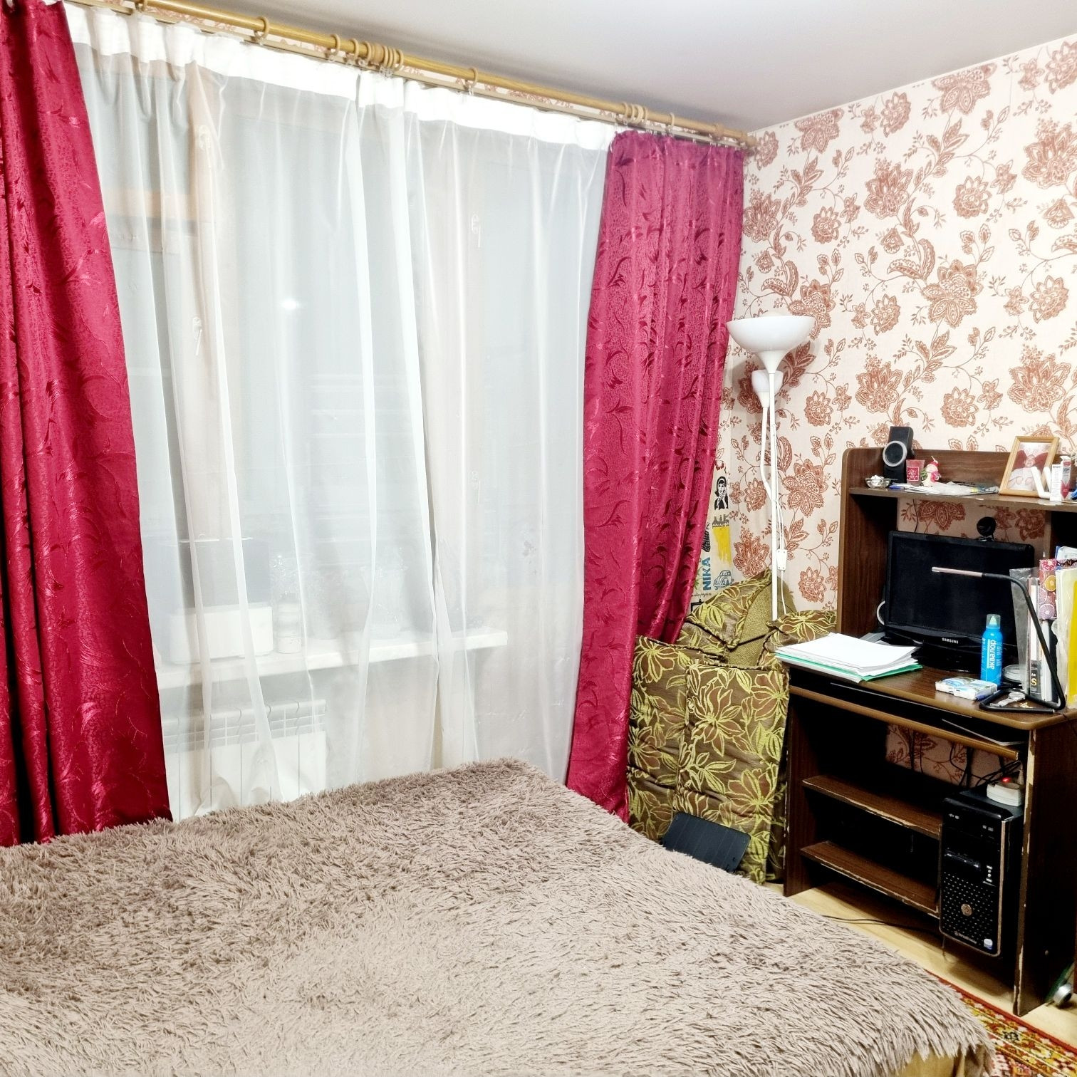 В квартире был сделан ремонт: полная замена электрики, сантехники, батарей (с регулировкой температуры отопления), выровнены стены, на 2 окнах деревянные стеклопакеты, на третьем - стандартный стеклопакет, тёплый пол на кухне.