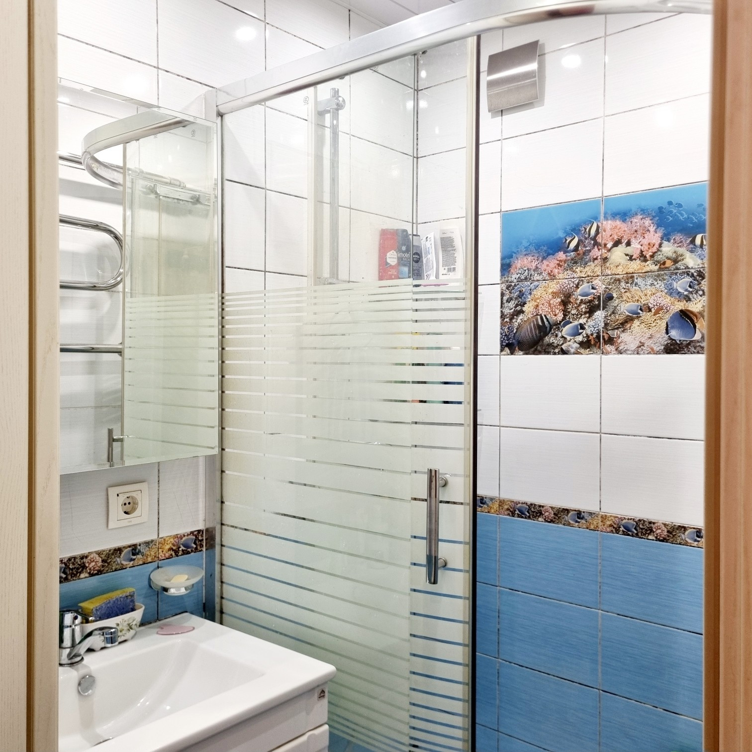 Потолки - натяжные, потолочные панели, пол - ламинат и кафель, балкон застеклен. Декоративную отделку можно будет поменять без больших вложений в ремонт, так как черновые работы не потребуются.