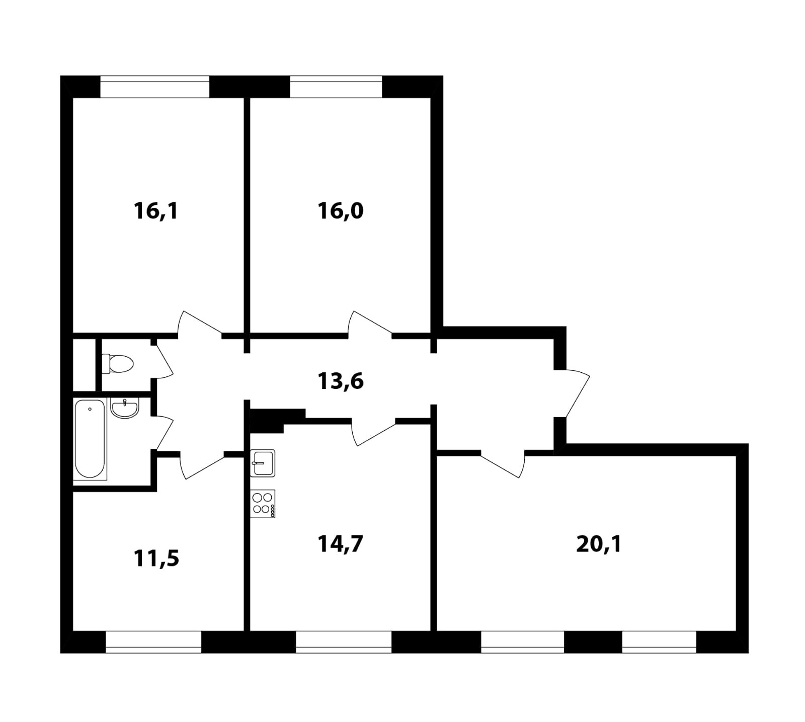 Квартира светлая и очень тёплая. Окна выходят на две стороны. Общая площадь 95,6 кв.м. Комнаты изолированы и правильной формы (20,1 кв.м+16,1 кв.м+16 кв.м+11,5 кв.м.)