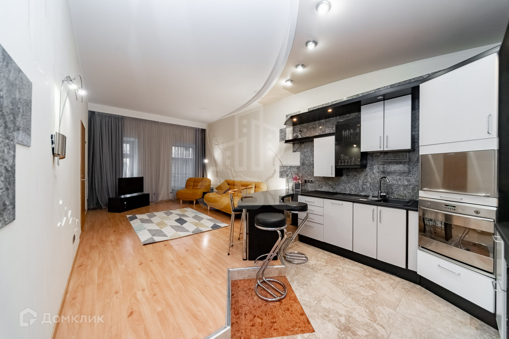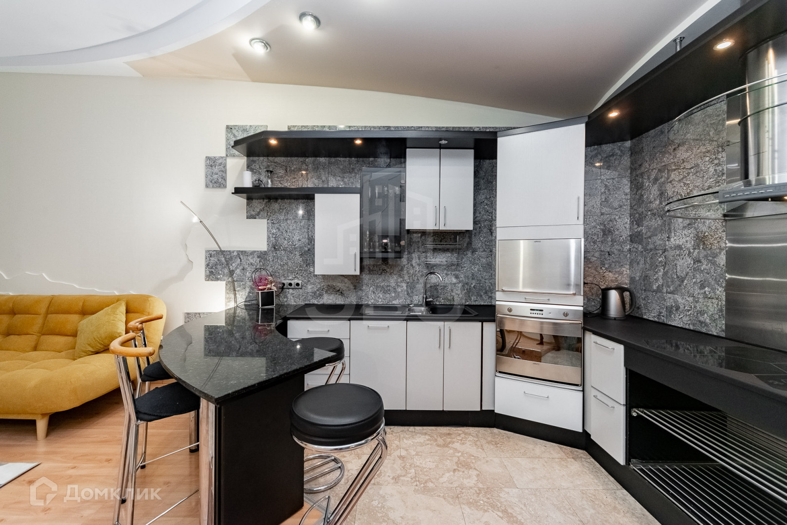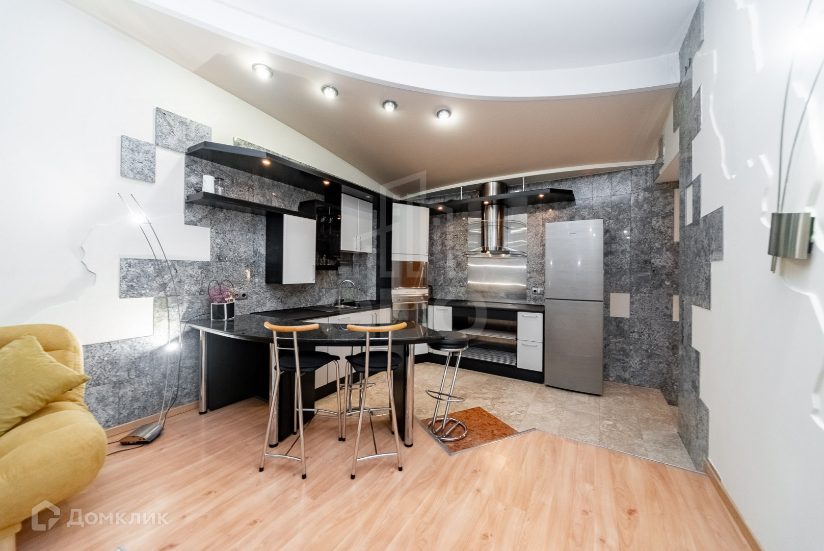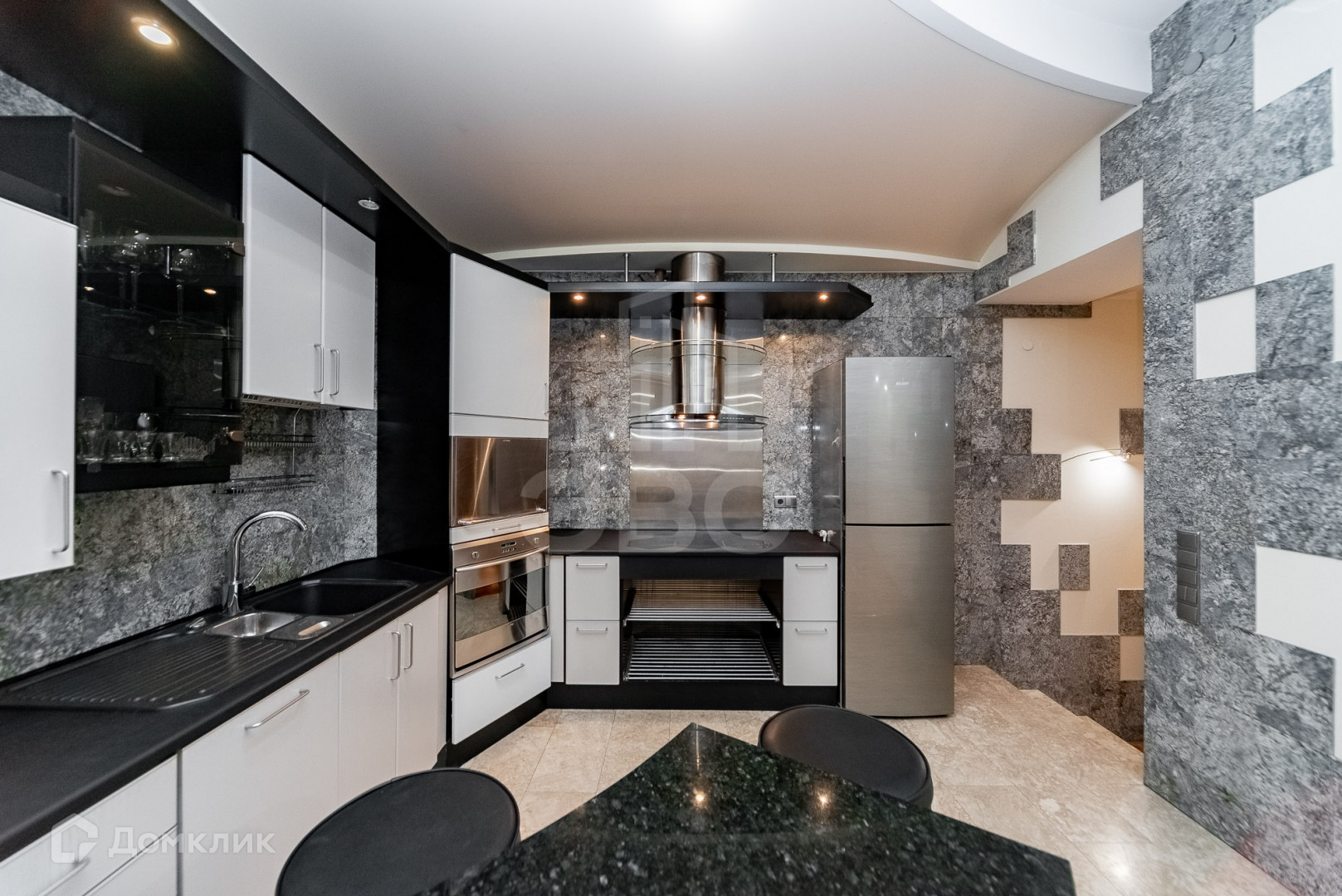 Пол коридора, кухонная зона и барная стойка из натурального камня.