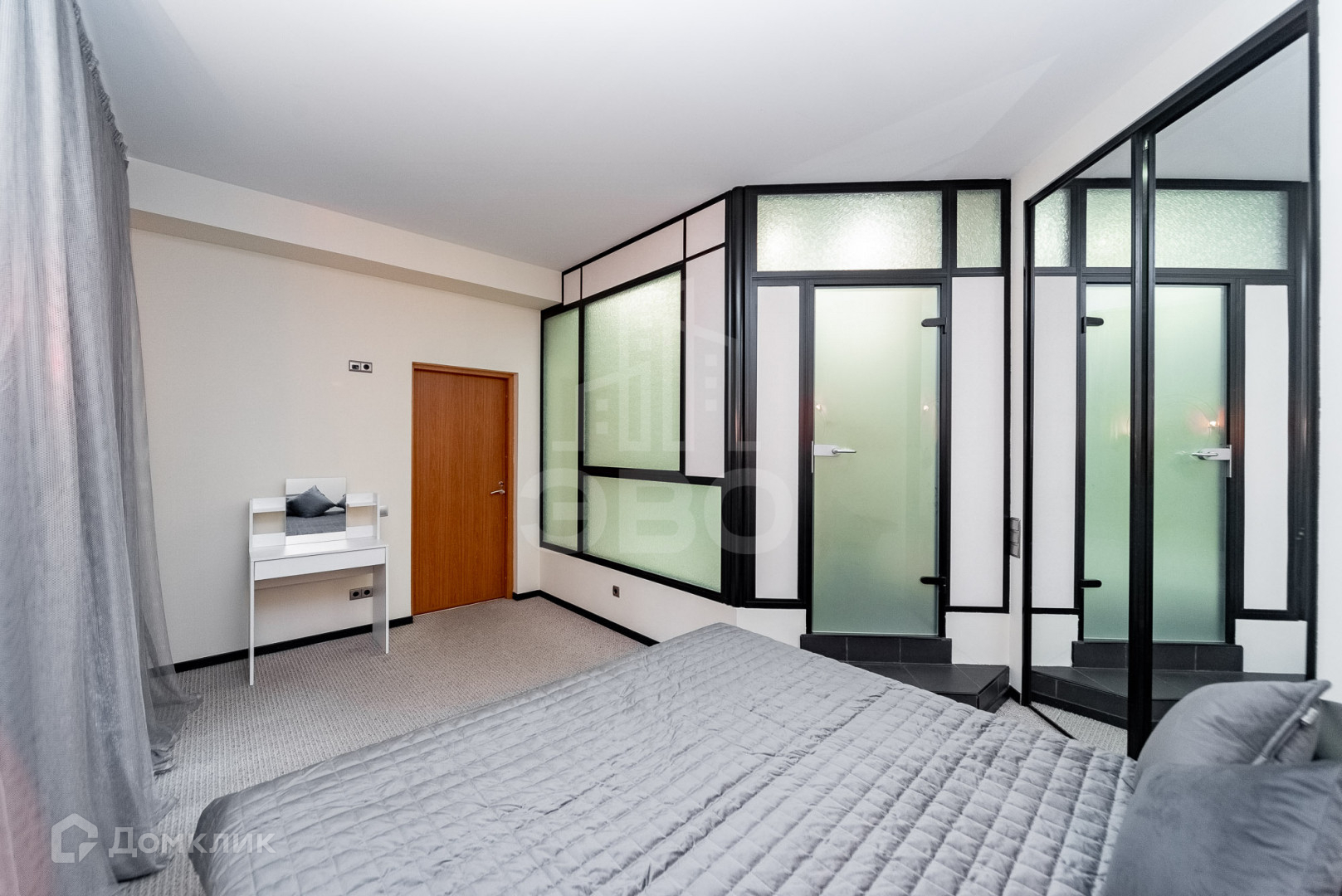 Кухня-гостиная гармонично переходит в спальню с большой гардеробной и зоной для сна с итальянкой кроватью 2х2.