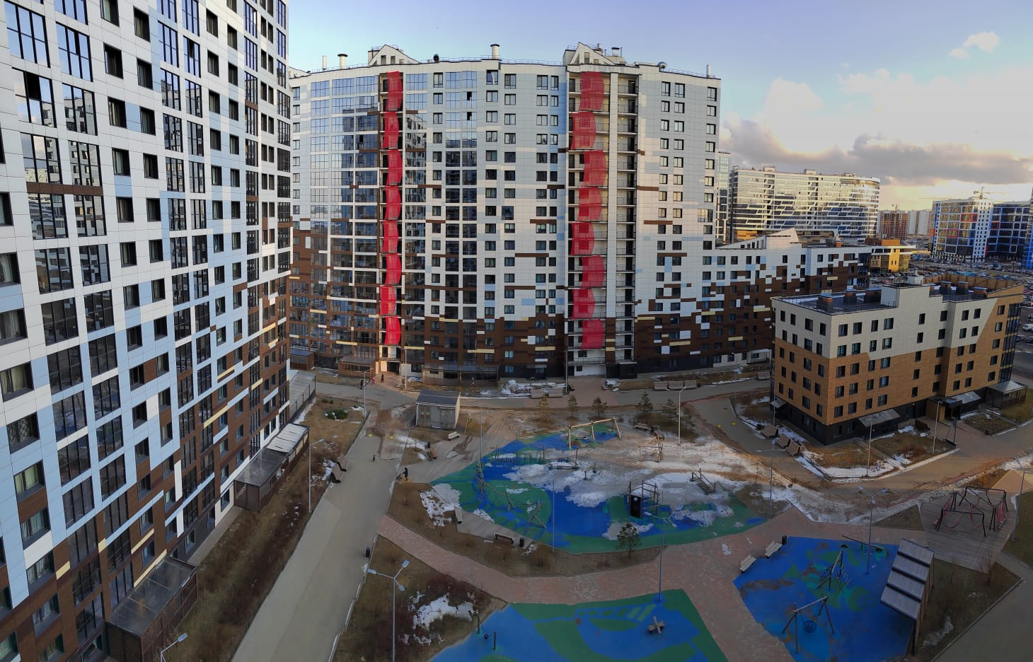 Территория ЖК огорожена по периметру, видеонаблюдение. На территории имеются детские и спортивные площадки, зоны для отдыха и барбекю, продовольственные магазины.