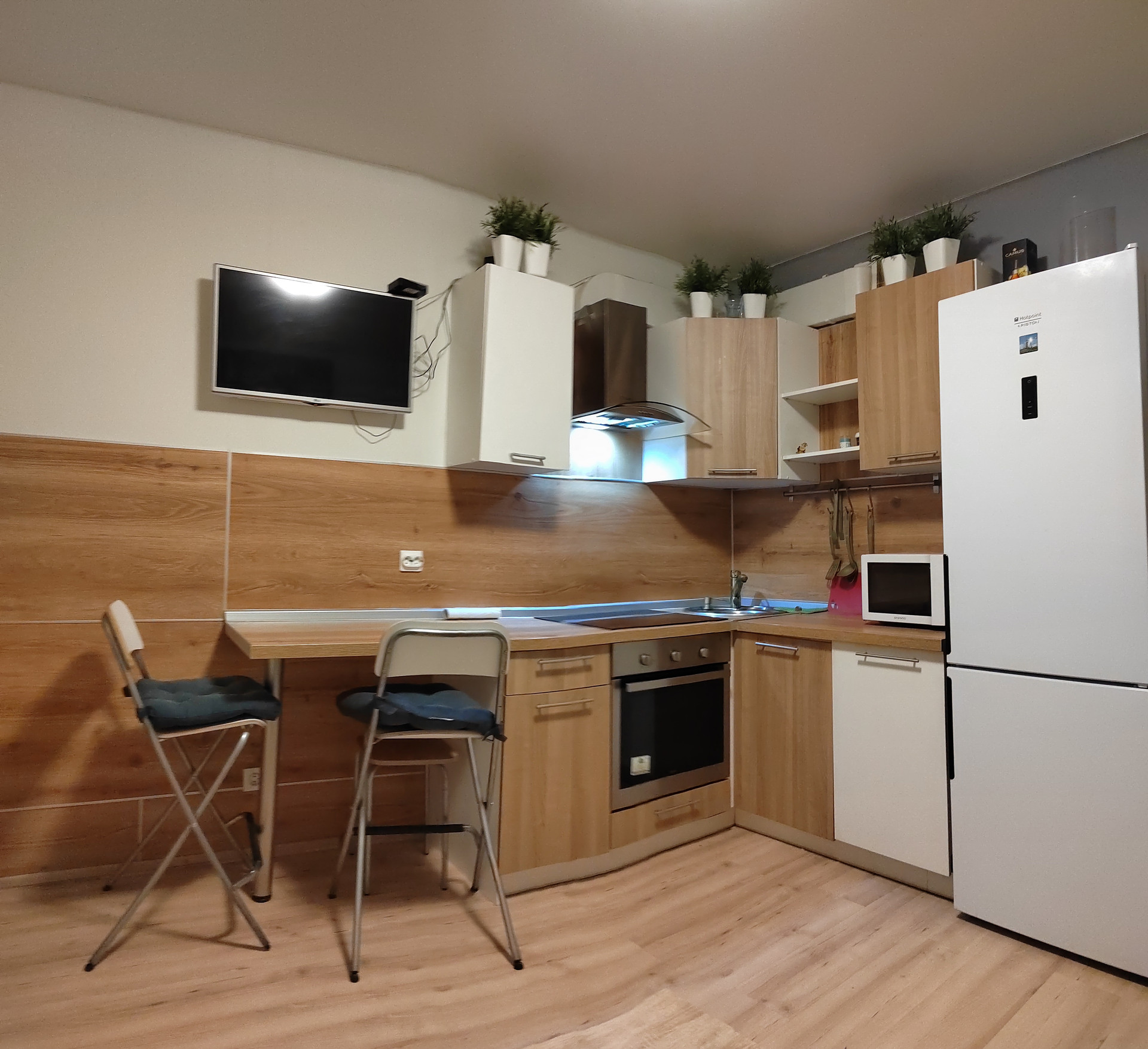 Просторная кухня 12 кв.м оборудована кухонным гарнитуром со встроенной бытовой техникой, включая посудомоечную машину и холодильник. Имеется также 2-х спальный диван. ЖК телевизор. С кухни выход на балкон с панорамным остеклением. На балконе установлен гамак.
