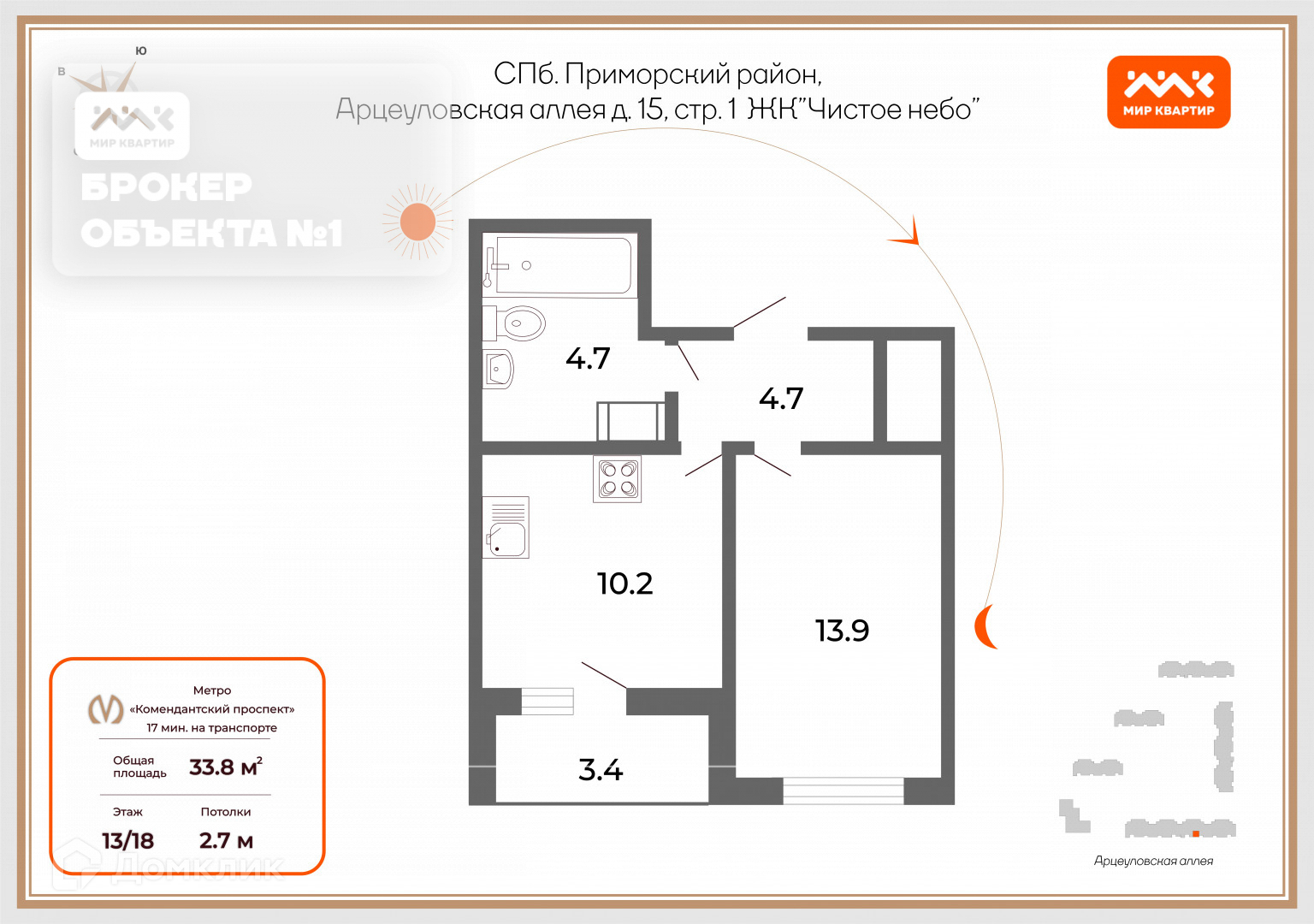 1-комнатная квартира, 33.8 м2, этаж 13 / 18, на продажу в Санкт-Петербурге, Арцеуловская аллея, 15