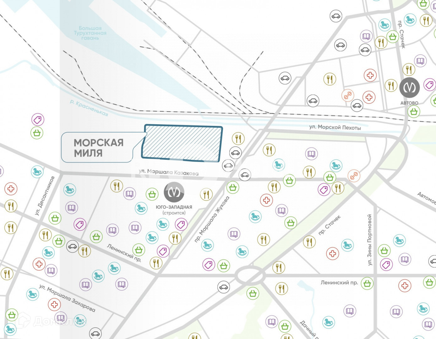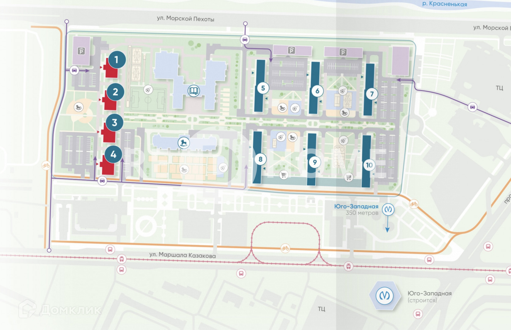 О РАЙОНЕ. Красносельский район. Пересечение улиц Маршала Жукова и Маршала Казакова. В 400 метров от ЖК в 2024 году открывается новая станция метро «Юго-Западная». В районе давно сформировалась необходимая инфраструктура: школы, детские сады, поликлиники, кафе, общественный транспорт.