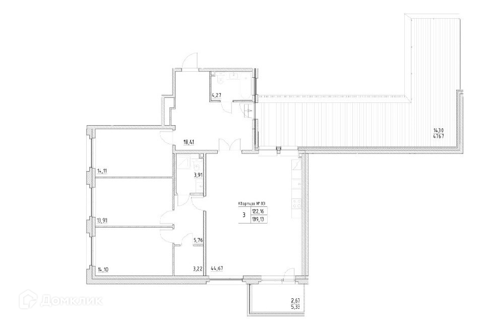 Просторная 3-комнатная квартира имеет общую площадь 122.16 м², приведенную 139.13 м².Удобная планировка: 3 отдельные спальни (14.10 м², 14.11 м², 13.91 м²), большая кухня-гостиная (44.67 м²), два отдельные санузла (3.91 м², 4.27 м²), гардеробная комната (3.22 м²).Большим преимуществом является наличие террасы (47.67 м²) и лоджии (5.33 м²)Высокие потолки 3 метра7 этаж (7/9)Всего три квартиры на этажеВыбирайте для себя лучшее, выбирайте данную квартиру в премиальном жилом комплексе Квадрия!