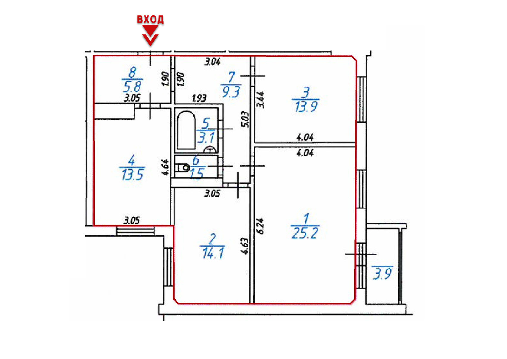 Общая площадь квартиры 86,4 кв.м площадь комнат (25,2+13,9+14,1 кв.м) площадь кухни 13,5 кв.м. раздельный санузел, застекленная-утепленная лоджия, просторный коридор.
