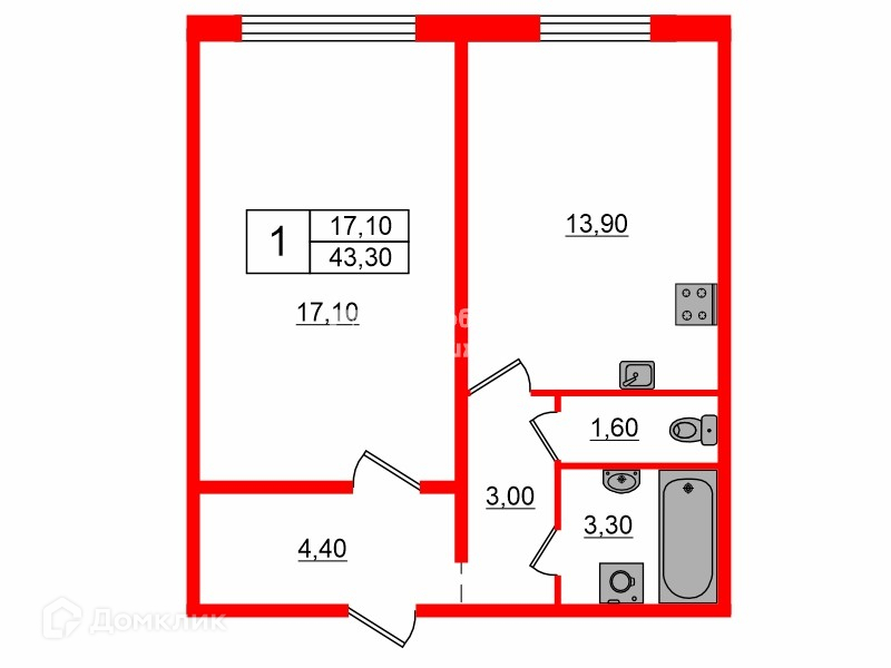 Общая площадь 43.3 м2