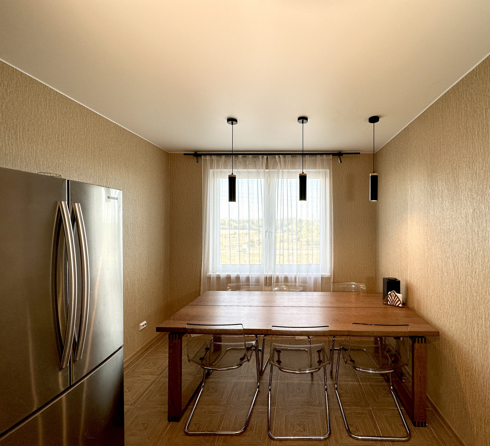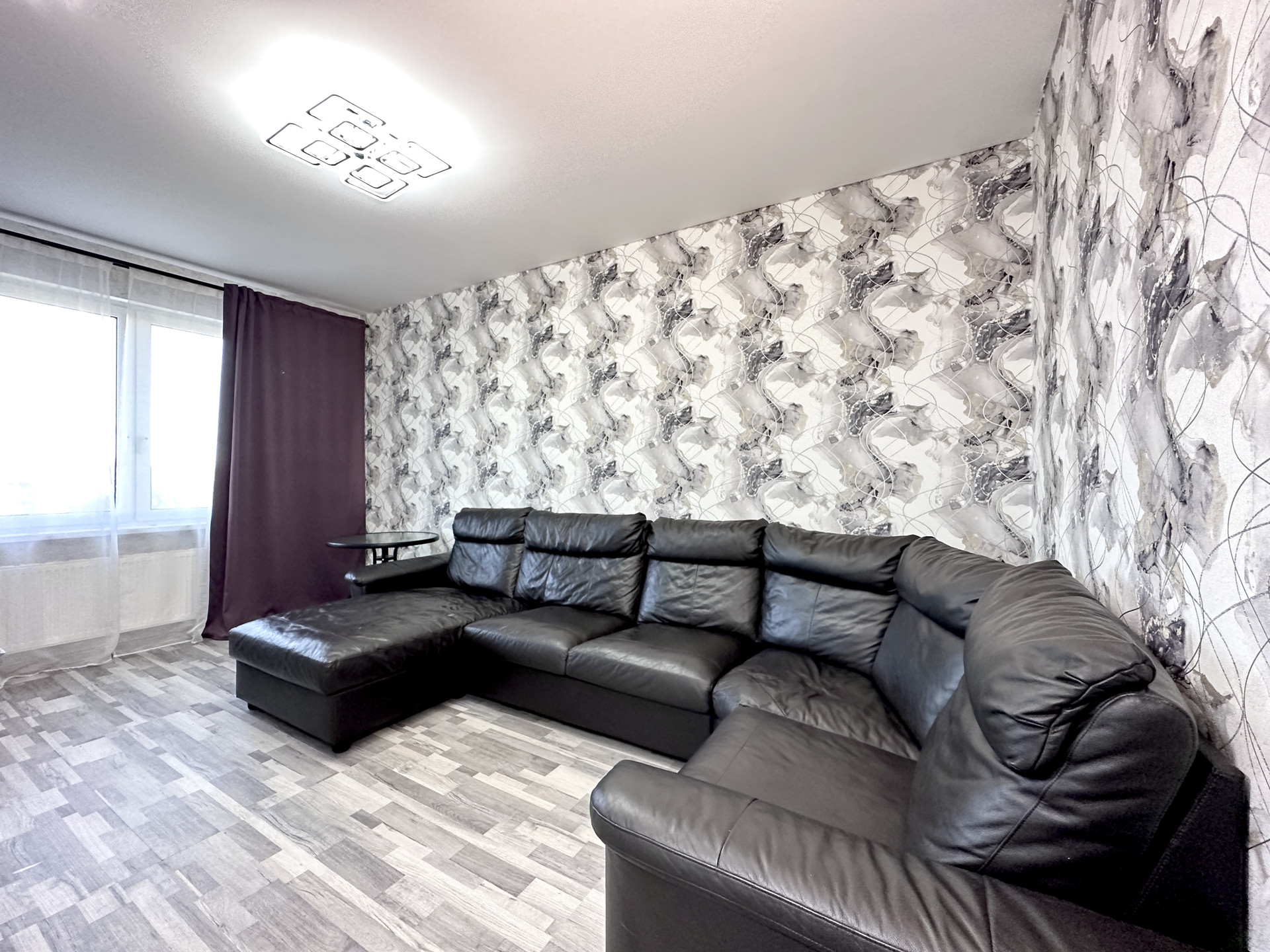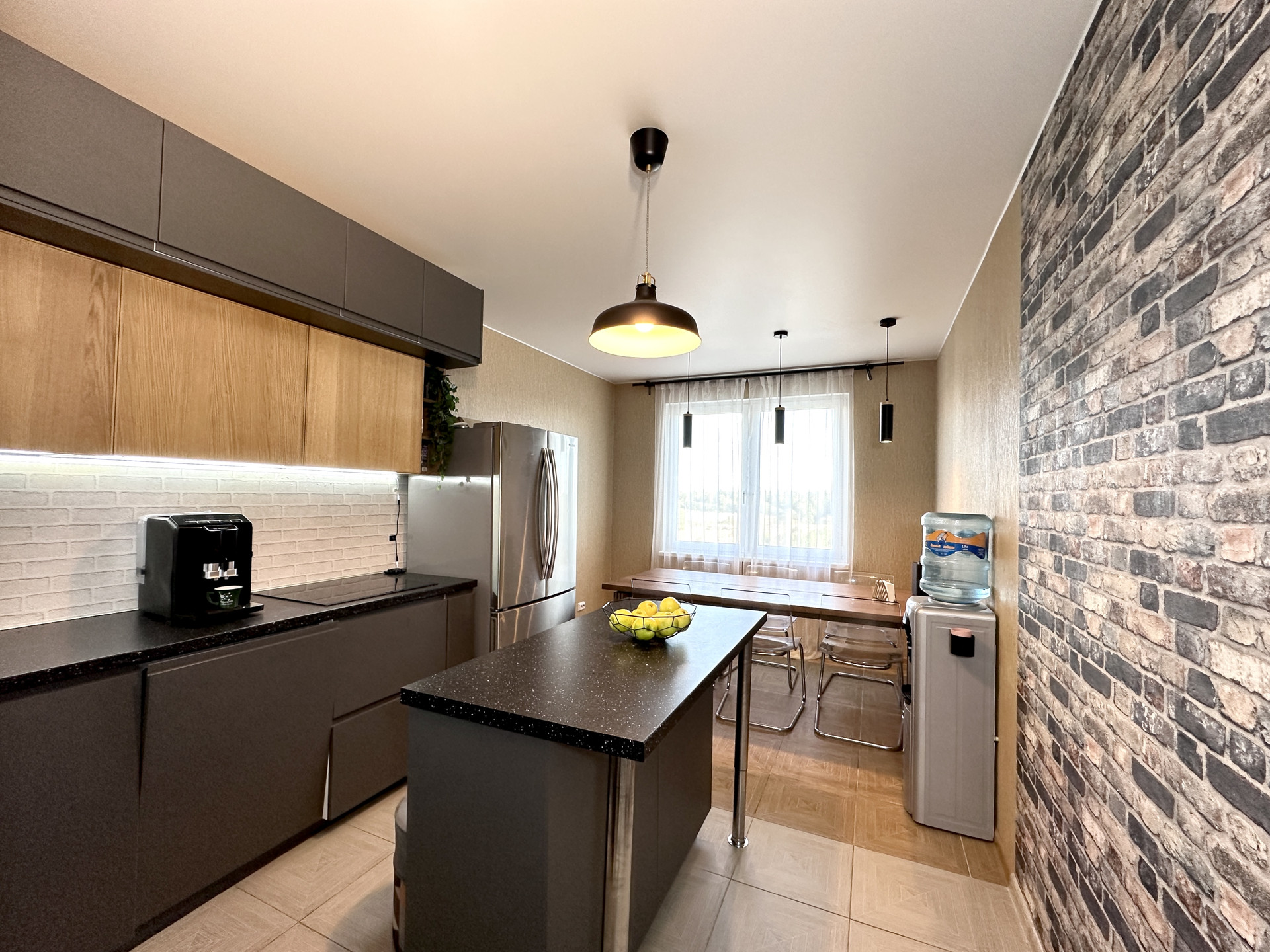 - Удобная кухня-гостиная правильной формы с большим окном