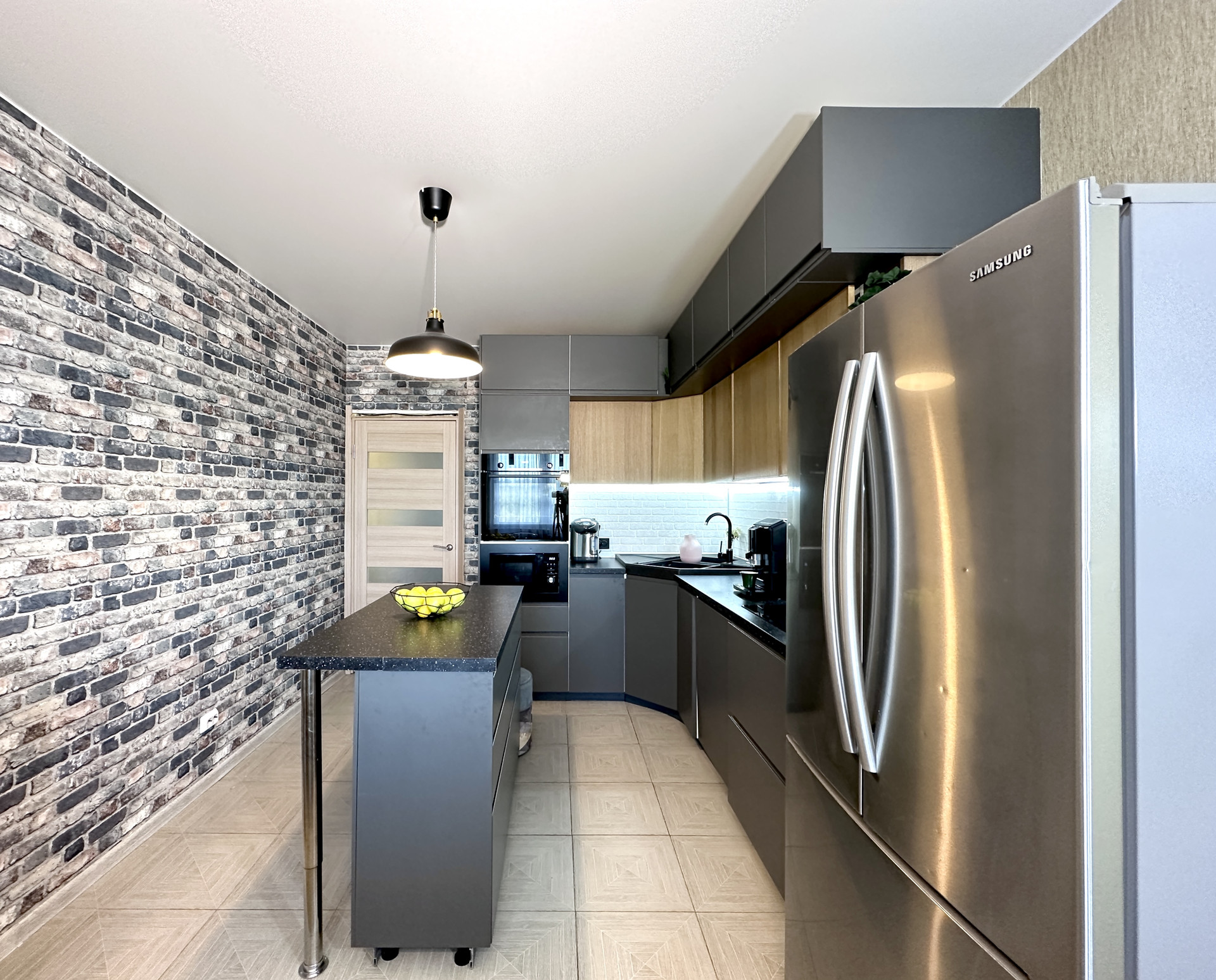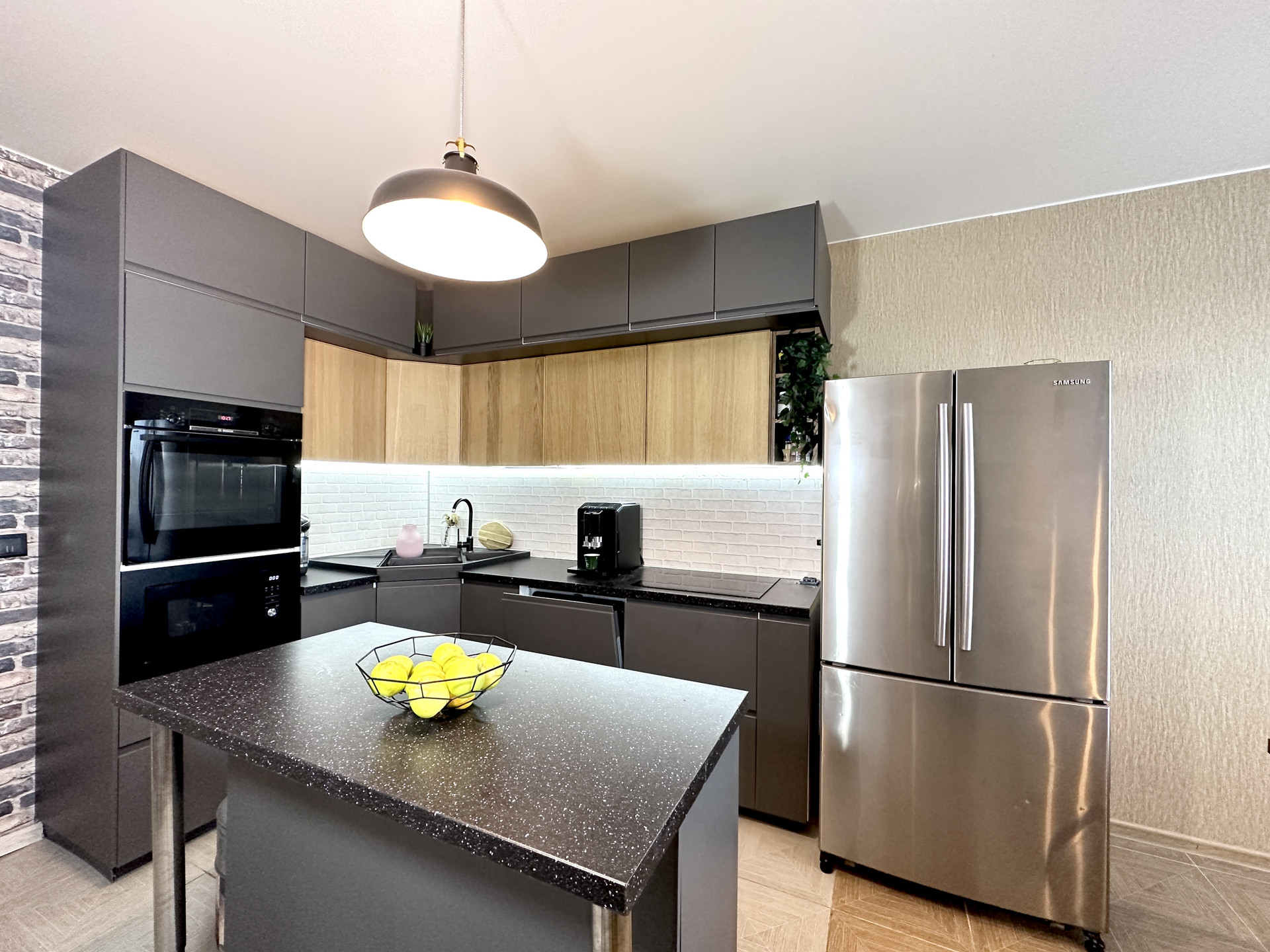 В квартире сделан качественный ремонт. Кухня выполнена по индивидуальному заказу с использованием дорогих импортных материалов, в санузле и ванной комнате также сделан дизайнерский ремонт и итальянская сантехника.