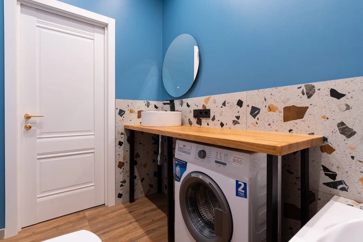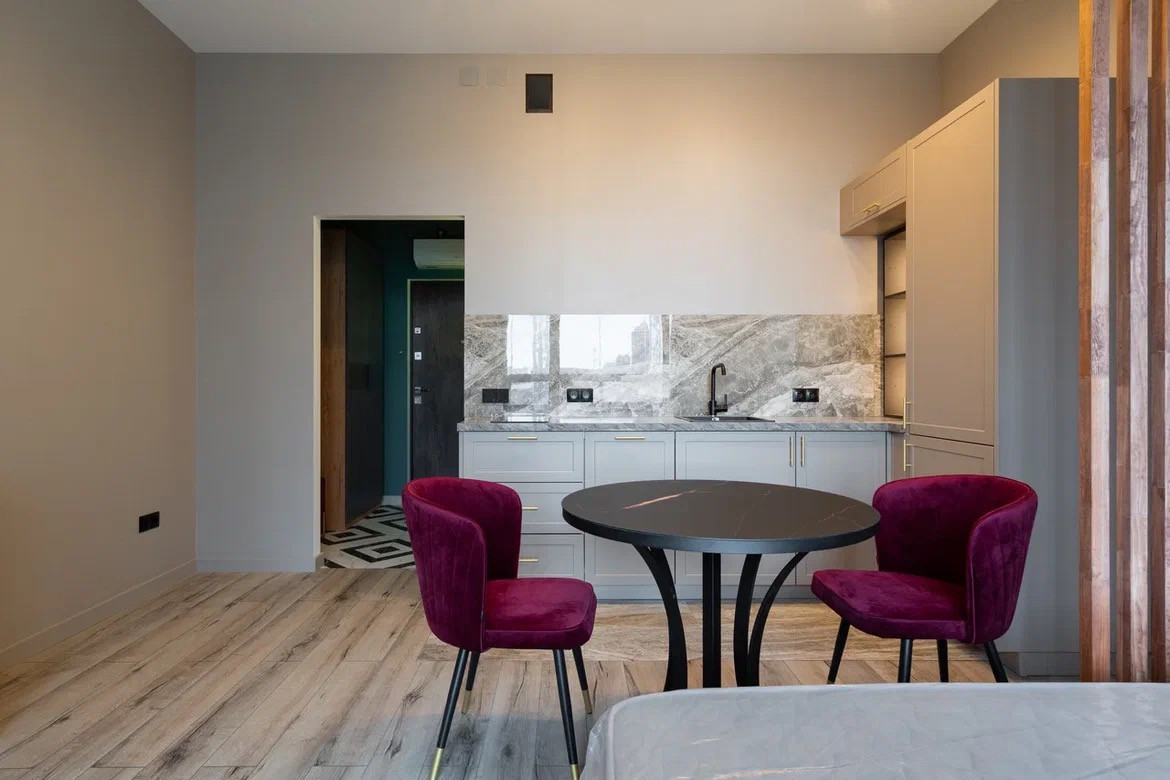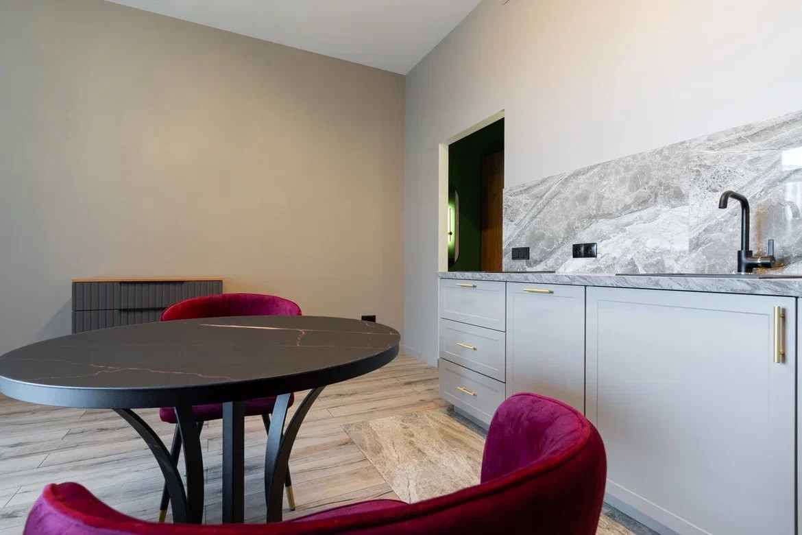 •Кухня с необходимой бытовой техникой: варочная поверхность, посудомоечная машина, встроенный холодильник.