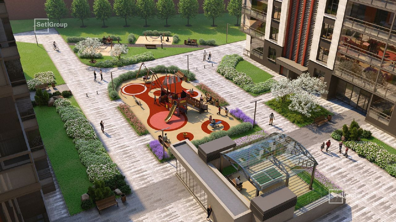 Доступ на территорию осуществляется через одну из трех центральных входных групп с ресепшн, круглосуточной охраной. Придомовая территория закрыта от посторонних. В каждом дворе установлены игровые площадки, беседки с навесом от непогоды и места для комфортного отдыха. Холлы каждого корпуса оформлены по индивидуальному проекту. Особое внимание уделено контролю за безопасностью. Помимо центральных входных групп, перед входом в парадную установлены видеодомофоны. Для автомобилей доступен подземный паркинг. Также организован наземный паркинг с шлагбаумом и гостевой паркинг.