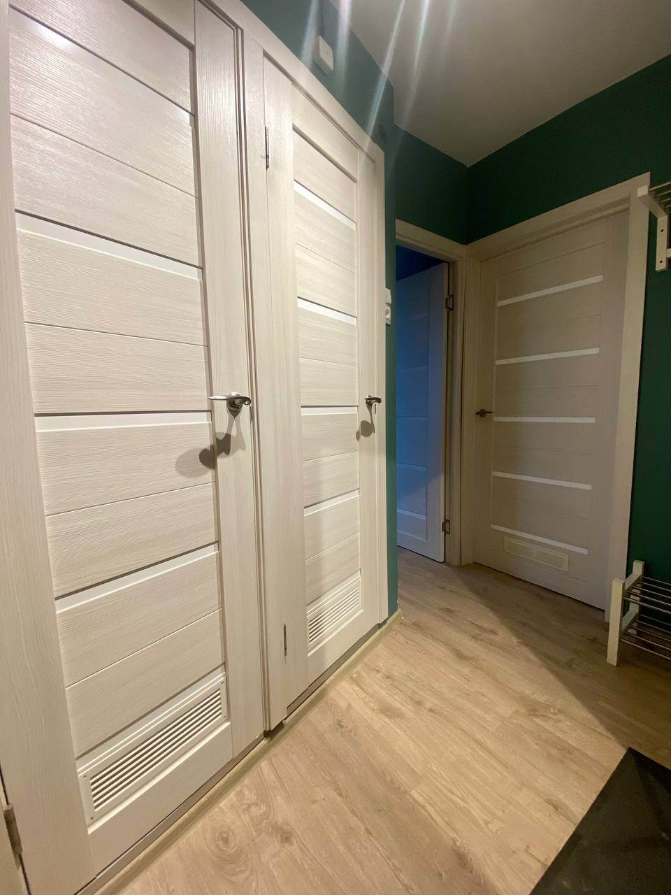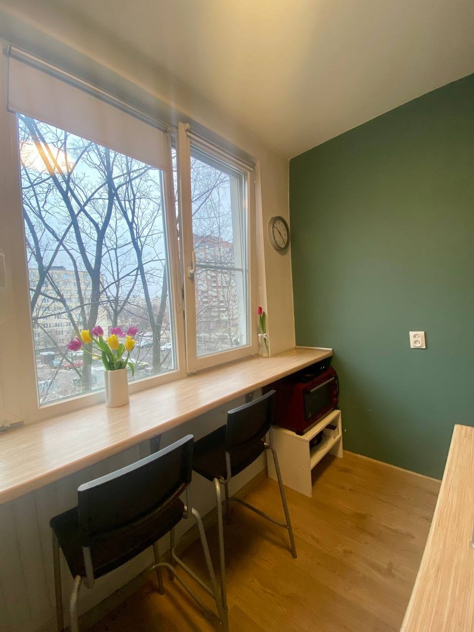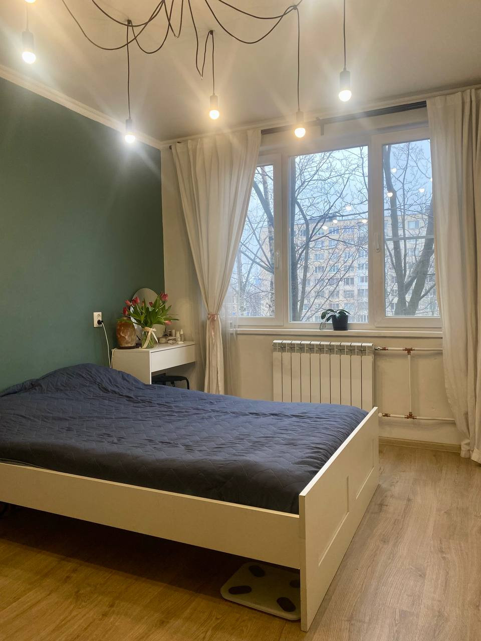 стены окрашены, уложен кафель в с/у, установлены стеклопакеты, 1 радиатор заменен на новый, полностью менялась разводка воды в квартире (кроме стояков), установлены счетчики на электроэнергию и водоснабжение