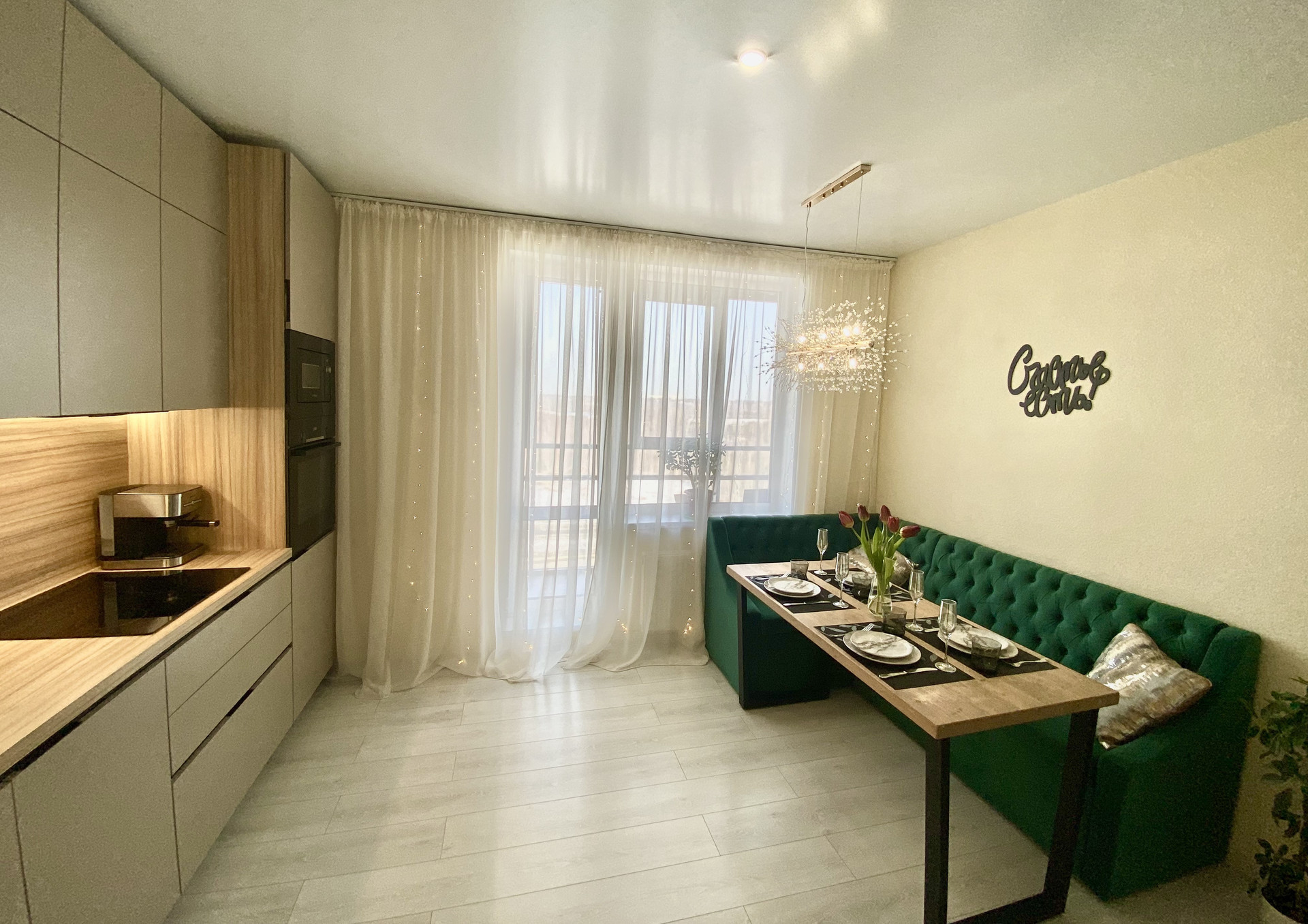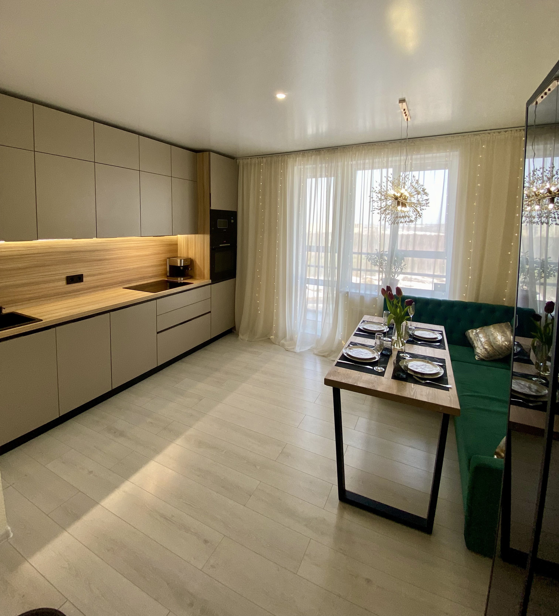 При выборе кухонного гарнитура были выбраны качественные материалы, вся техника Bosch, кроме встроенной вытяжки Electrolux. Вся техника новая, работает без нареканий, абсолютно в исправном состоянии. Установлены фильтры для повышенной очистки воды Аквафор, что позволяет использовать ее грудничкам.
