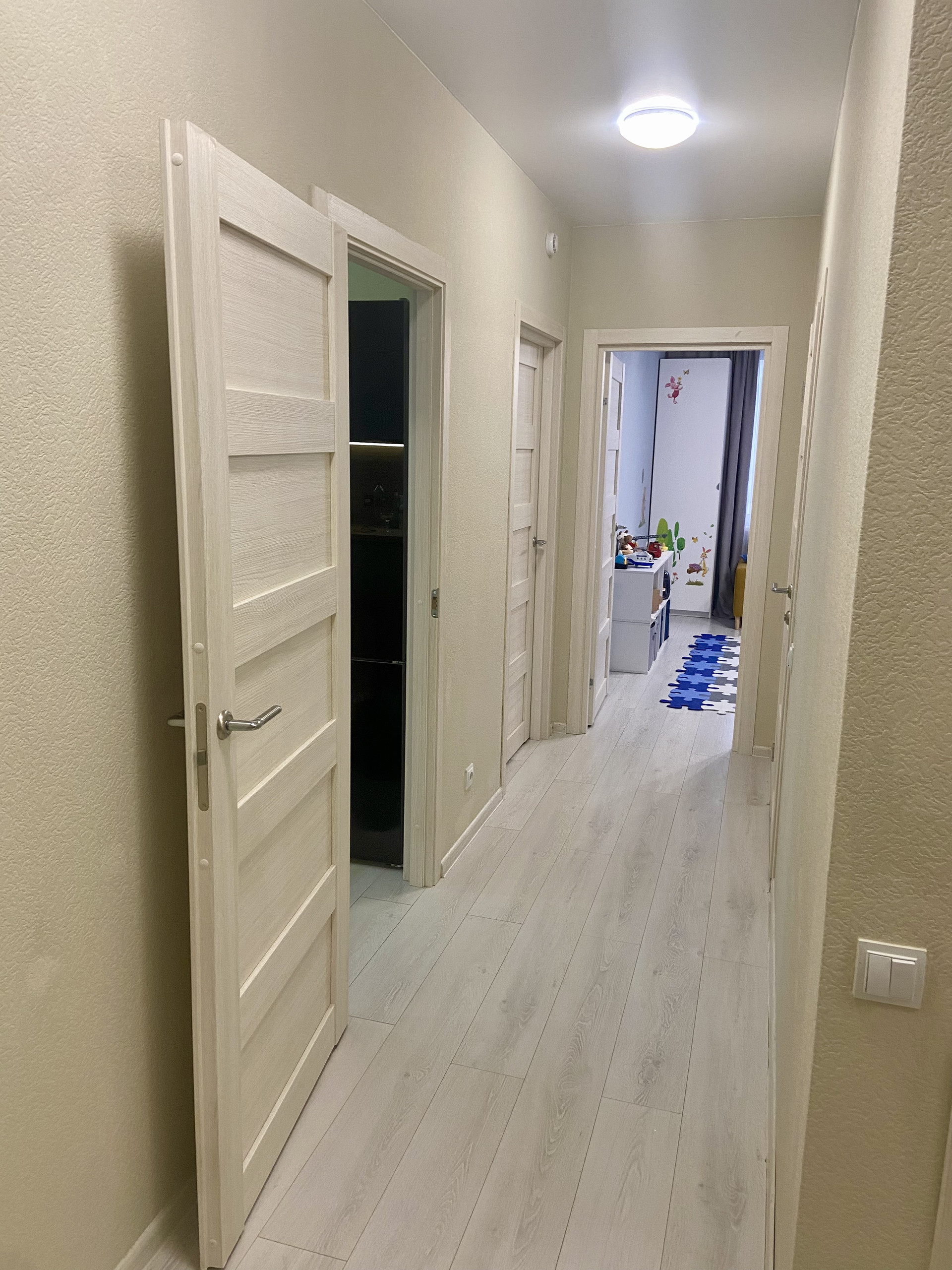 На полу ламинат 32 класса, натяжной потолок, на стенах обои под покраску – мы позаботились освежить стены перед продажей, чтобы у новых хозяев создалось ощущение новизны.