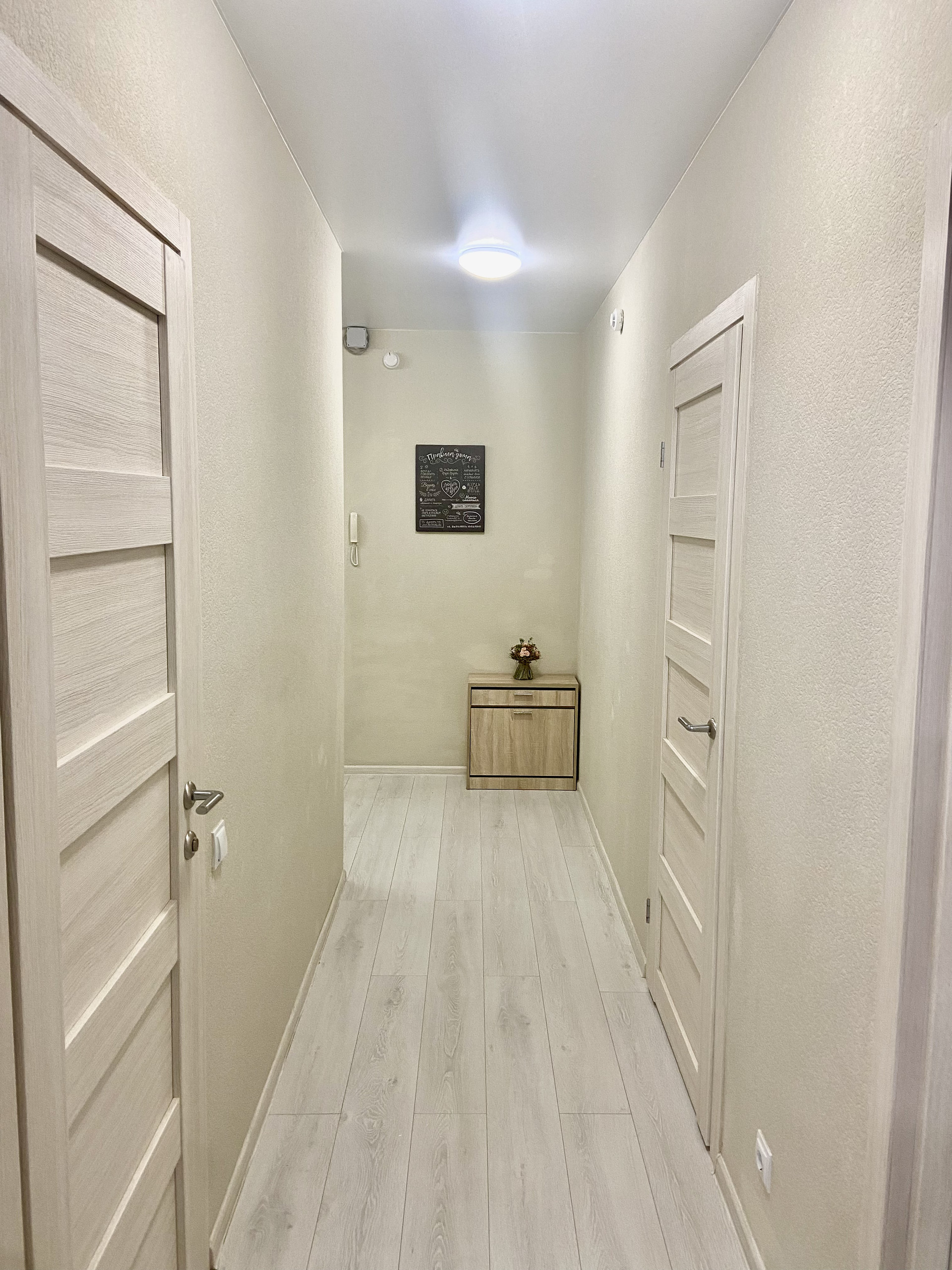 В коридоре реализован встроенный шкаф-купе с двумя огромными дверьми-зеркалами в потолок. Шкаф достаточно вместительный, выполняет роль небольшой гардеробной на входе, зеркала визуально расширяют пространство, световое окружение выстроено так, чтобы делать коридор лучистым.