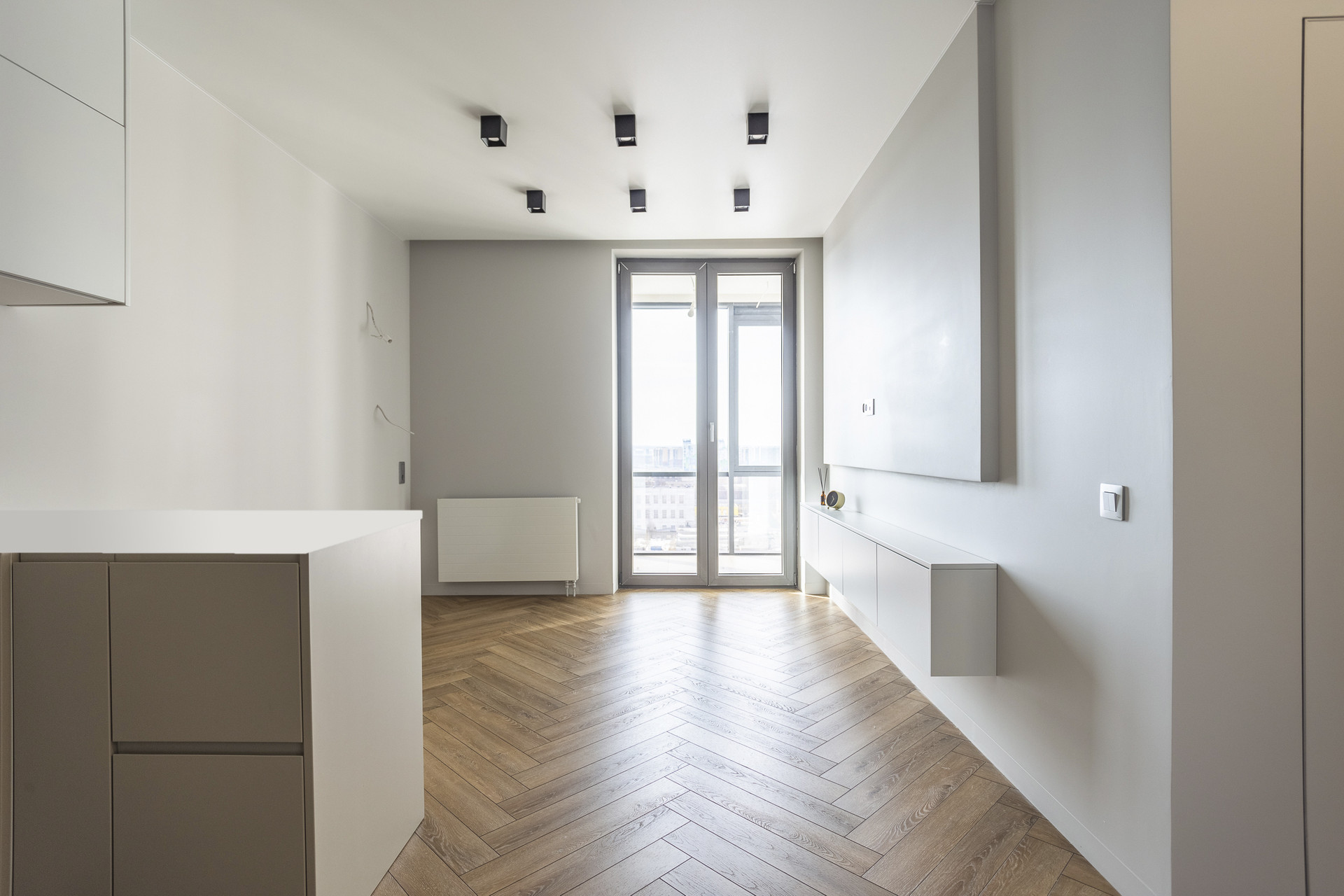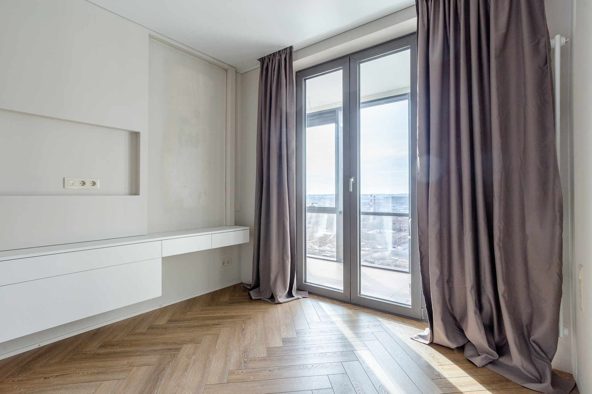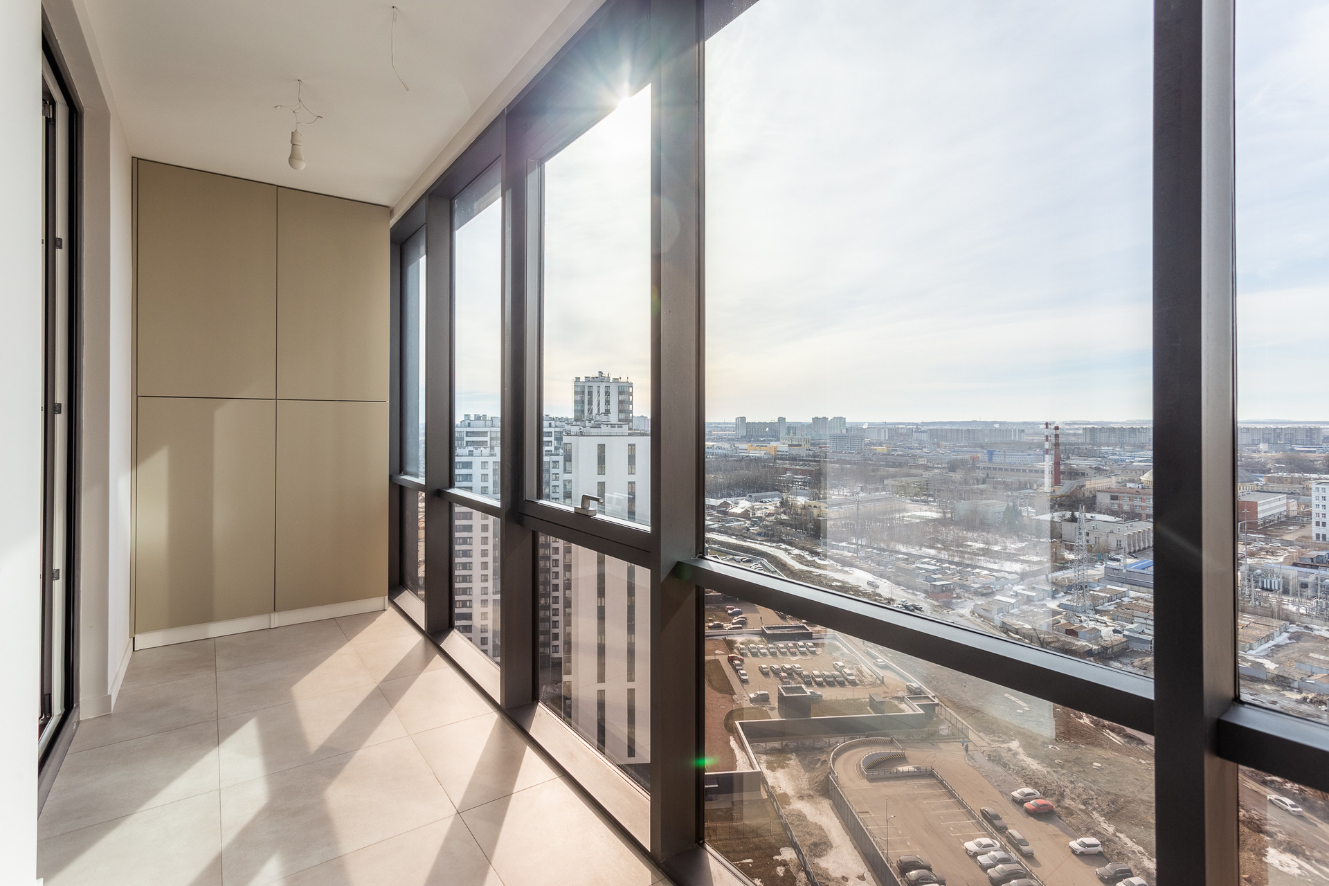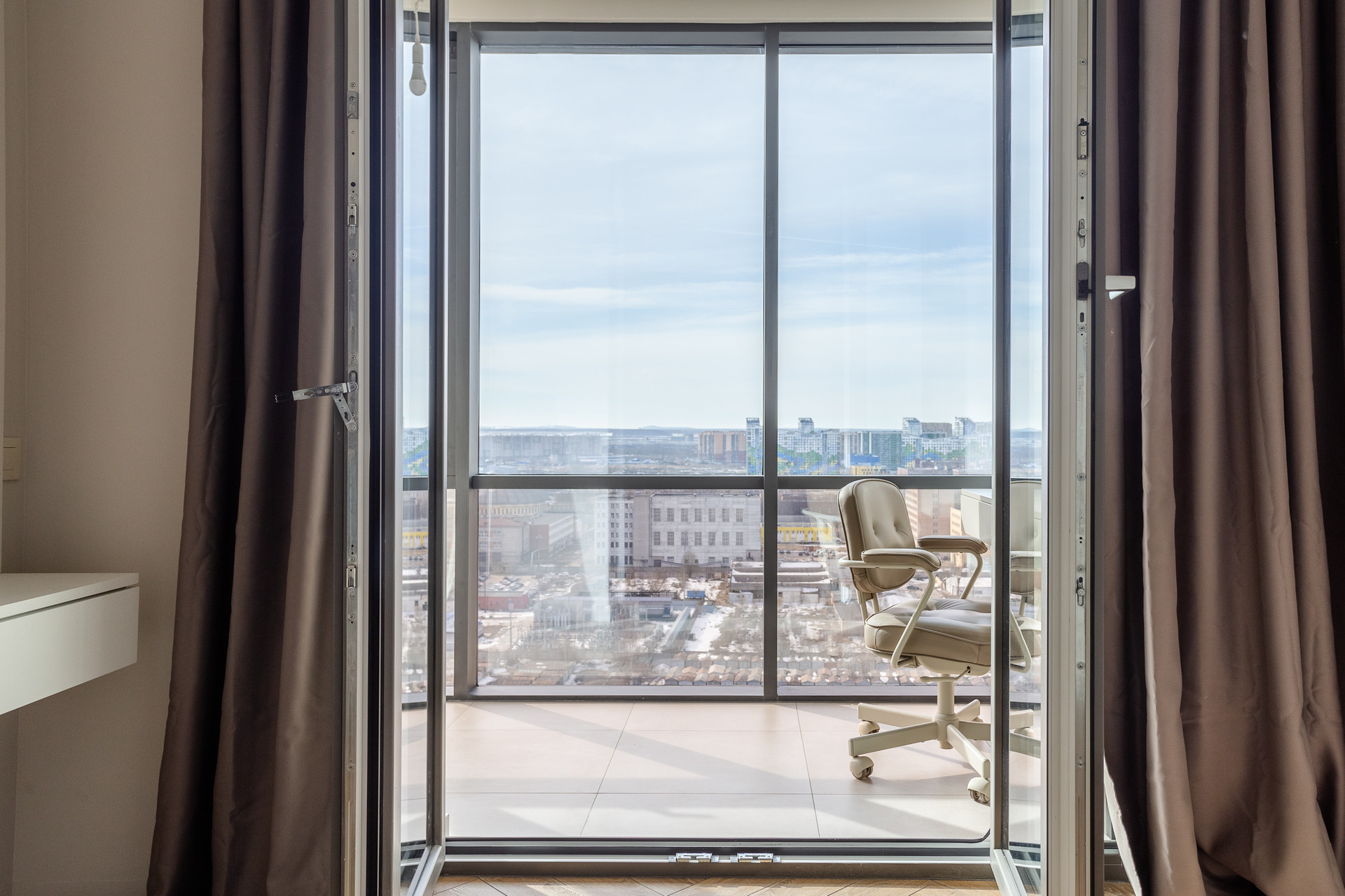 Квартира находится на 20 этаже, из окон открывается вид на городскую перспективу, на утепленной лоджии оборудовано место с рабочей зоной. Ванная комната большая - есть место для стиральной и сушильной машин. На кухне-гостиной есть зона отдыха с диваном и телевизором, и место для готовки с укомплектованной мебелью, необходимо только докупить технику.