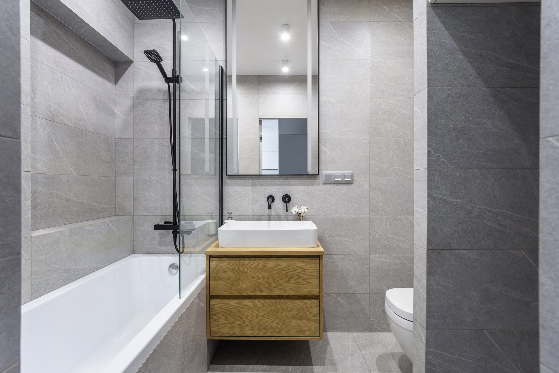 - В ванной: ящики для хранения из дерева под заказ, тумба для раковины под заказ, зеркало с подсветкой