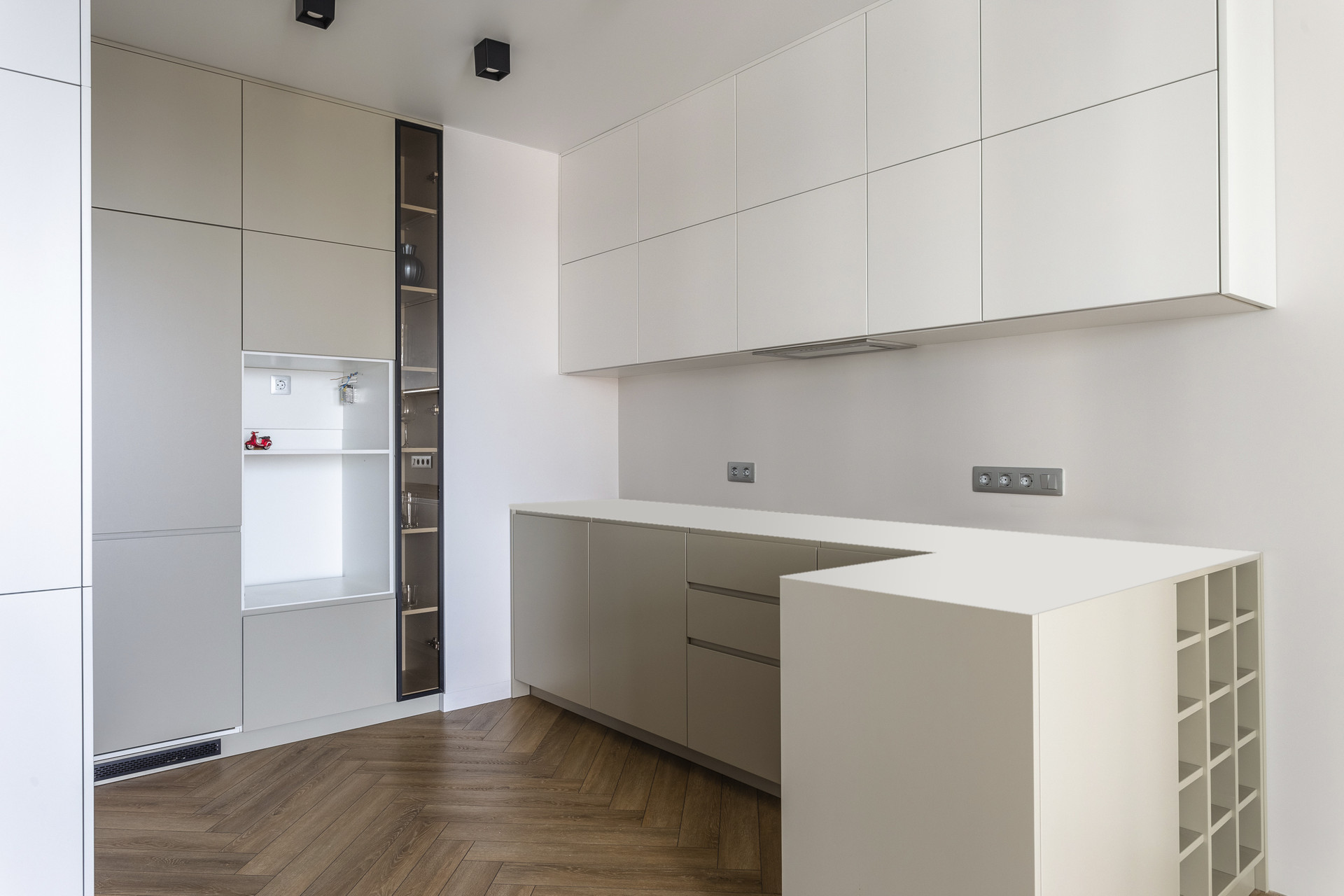 - Кухня с подсветкой, открывающаяся pushом, с выемками для встроенной техники, барная стойка, отсек для бутылок