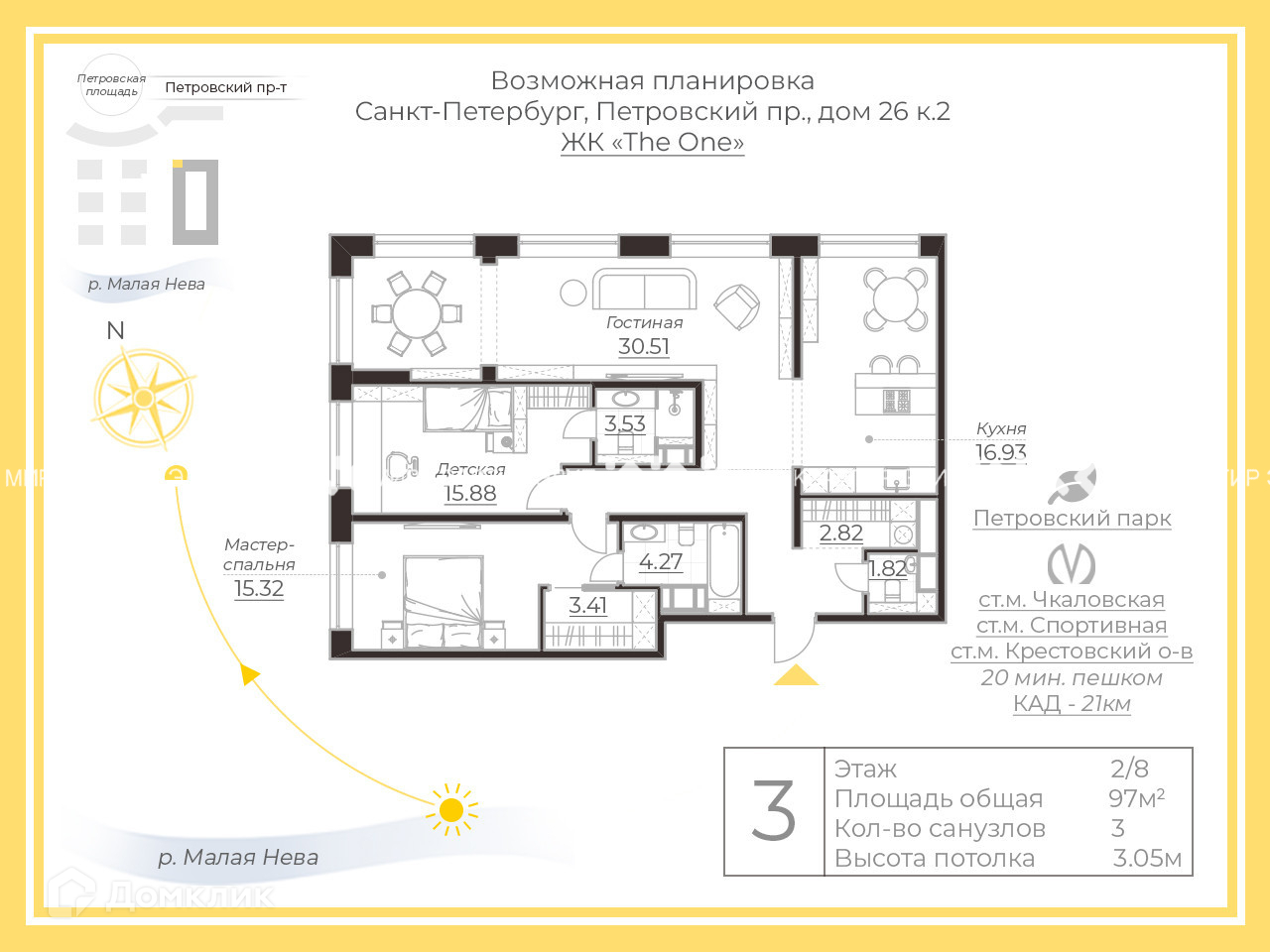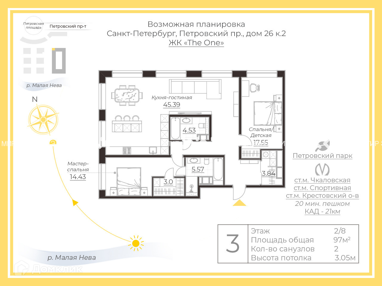 3-комнатная квартира, 97 м2, этаж 2 / 9, на продажу в Санкт-Петербурге, Петровский проспект, 26к2