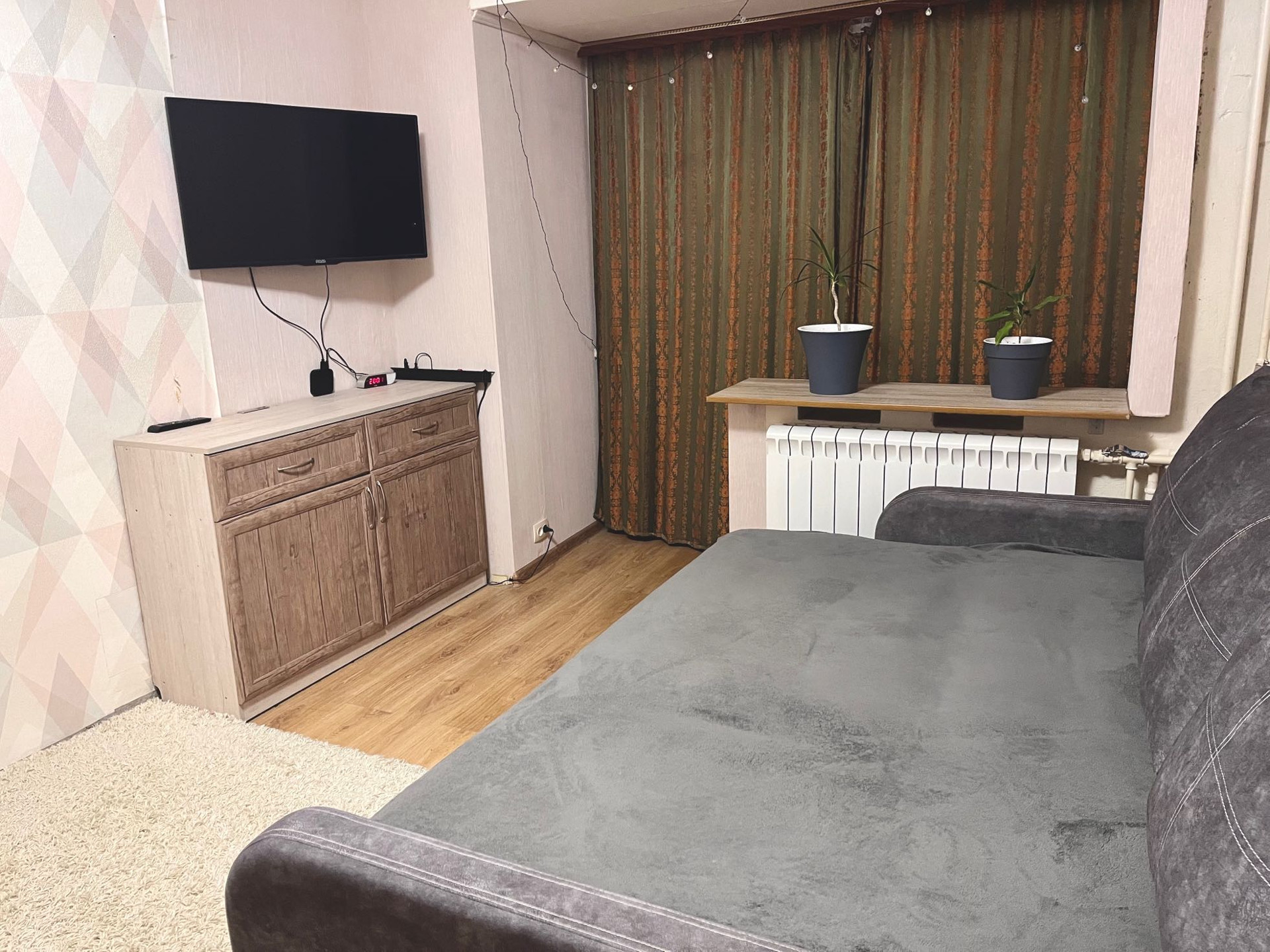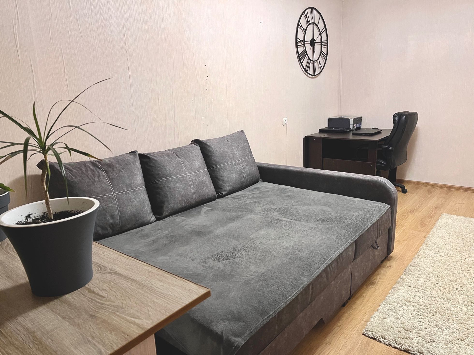 В большой комнате: двуспальный диван кровать, крупно-ворстный ковер, ТВ тумба и эргономичный раскладной стол.