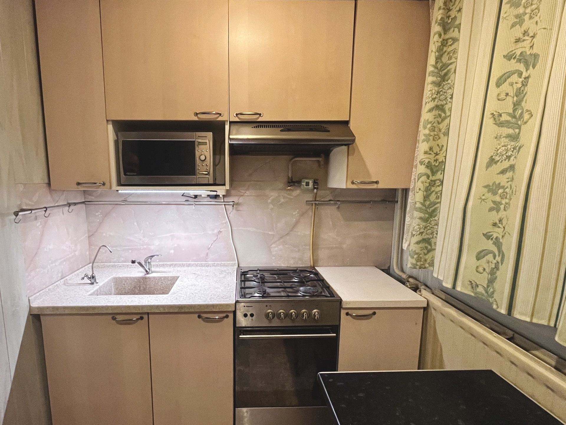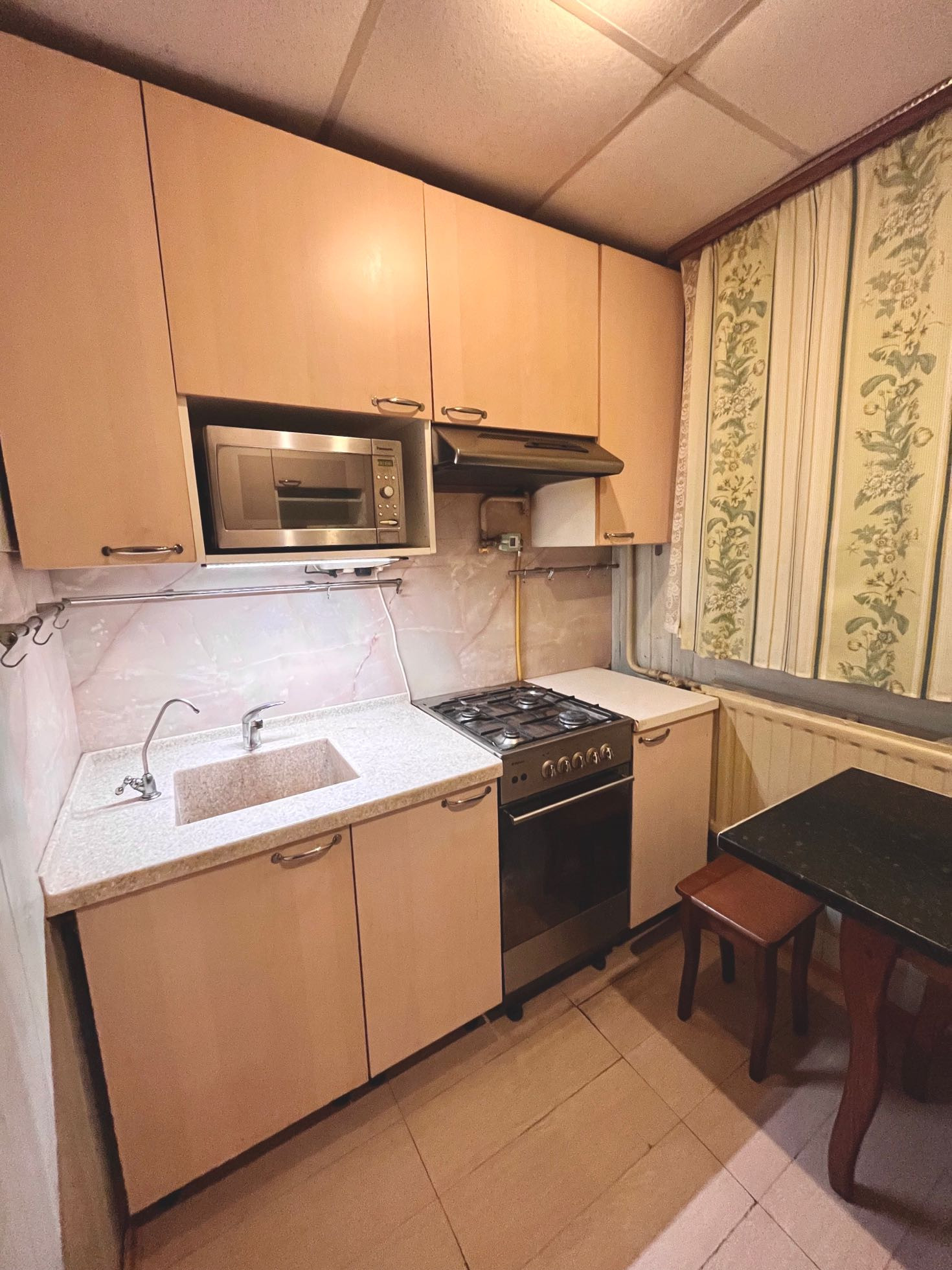 На кухне: весь необходимый гарнитур ИКЕА, плита, духовка, раковина из полированного керамогранита, холодильник, микроволновка и телевизор.