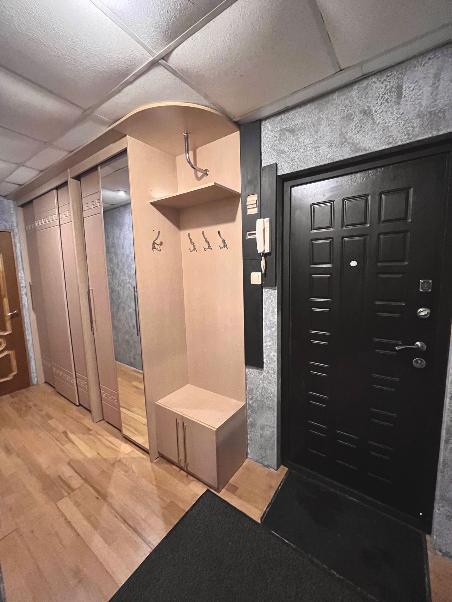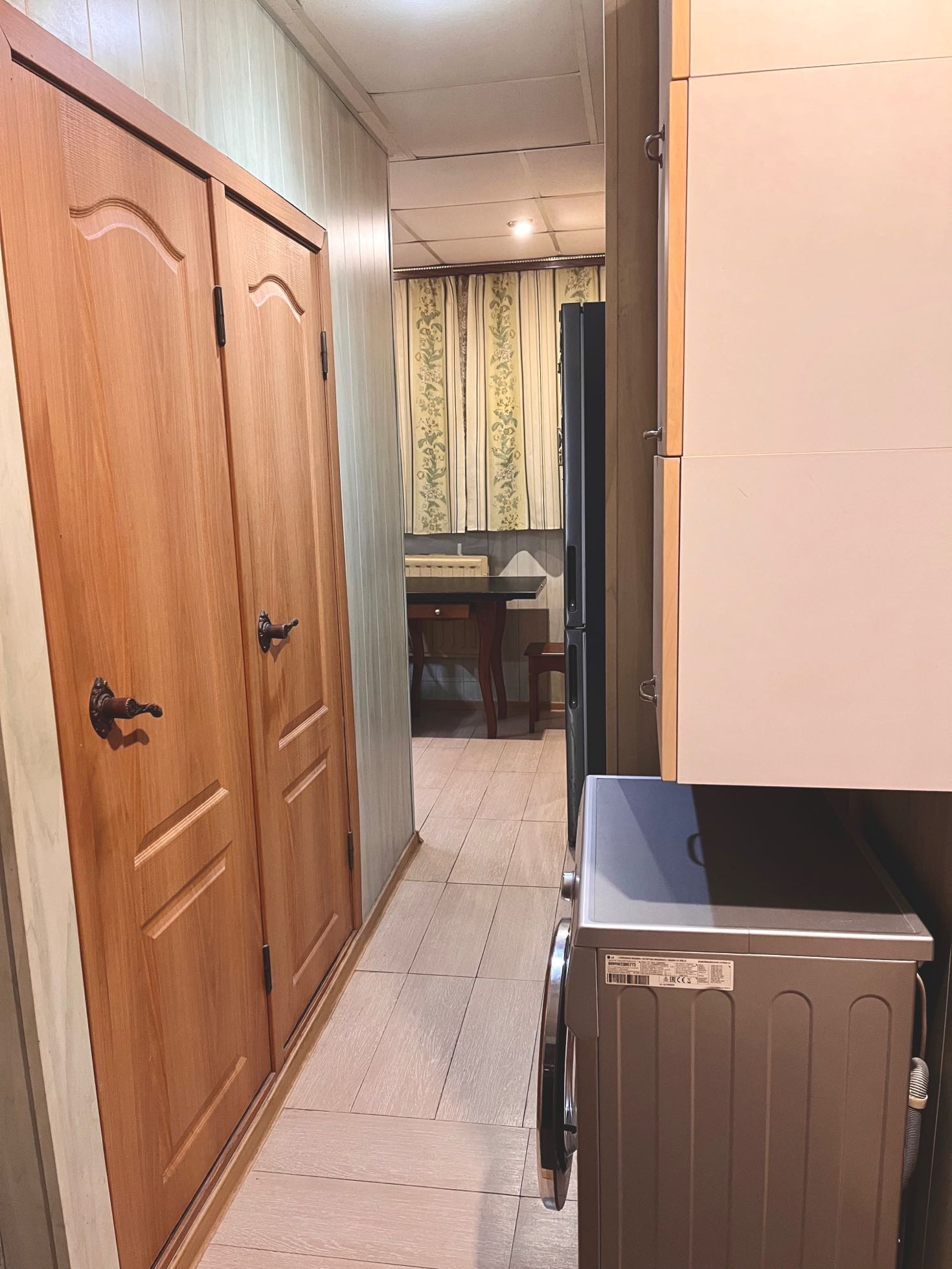 В коридоре: шкаф купе большой вместительности, установлена стиральная машинка,сделан отвод под неё под полом, предусмотрены удобные подвесные шкафы для химии и мелочей.