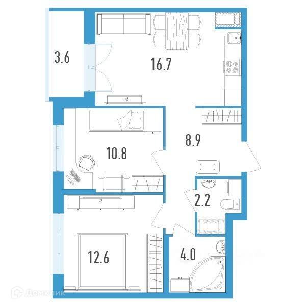 2)Жилая комната: 12,6 м²