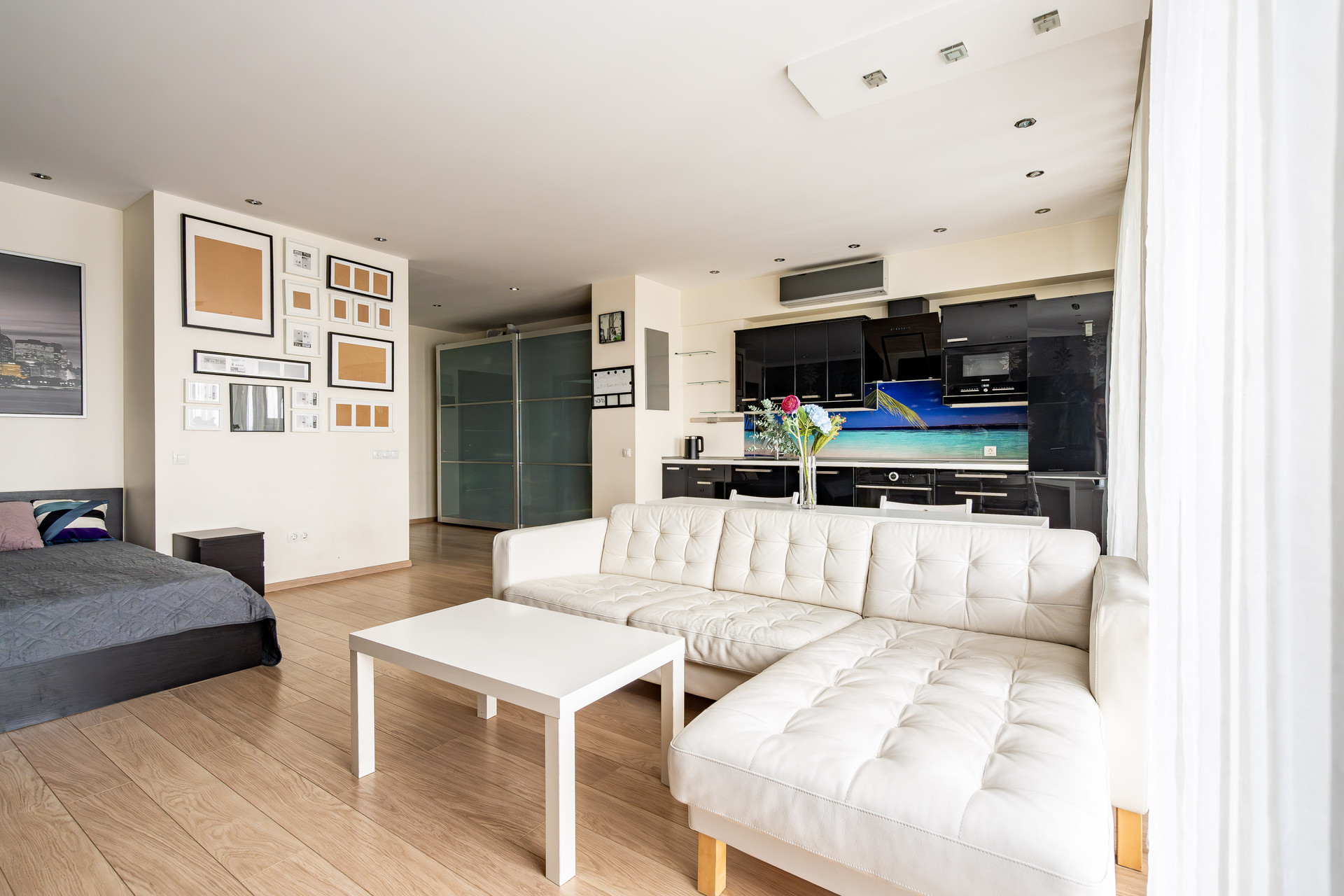 Студия оборудована всей необходимой бытовой техникой. Удобная двуспальная кровать, диван, просторный санузел.
