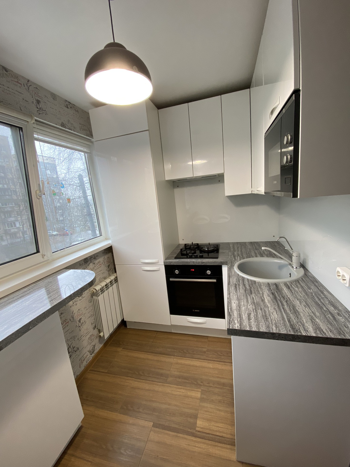 Кухня 6 кв.м. со встроенной мебелью и техникой Bosch, которая полностью остается новому владельцу (холодильник, духовой шкаф, посудомоечная машина, микроволновая печь, вытяжка). Кухня Мария с гарантией 10 лет.