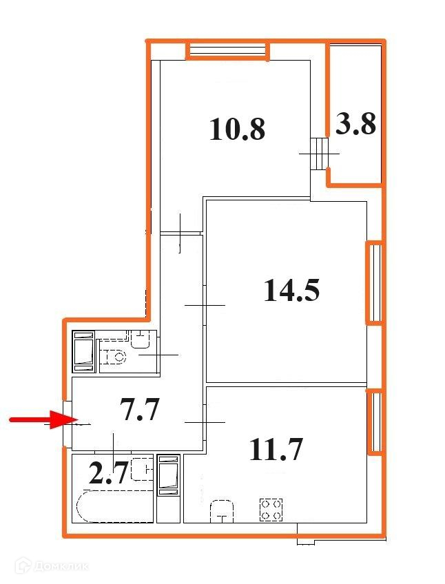 Просторная кухня-гостиная 11,7 кв.метров, две изолированные комнаты-спальни правильной формы 14,5 кв.метров и 10,8 кв.метров.