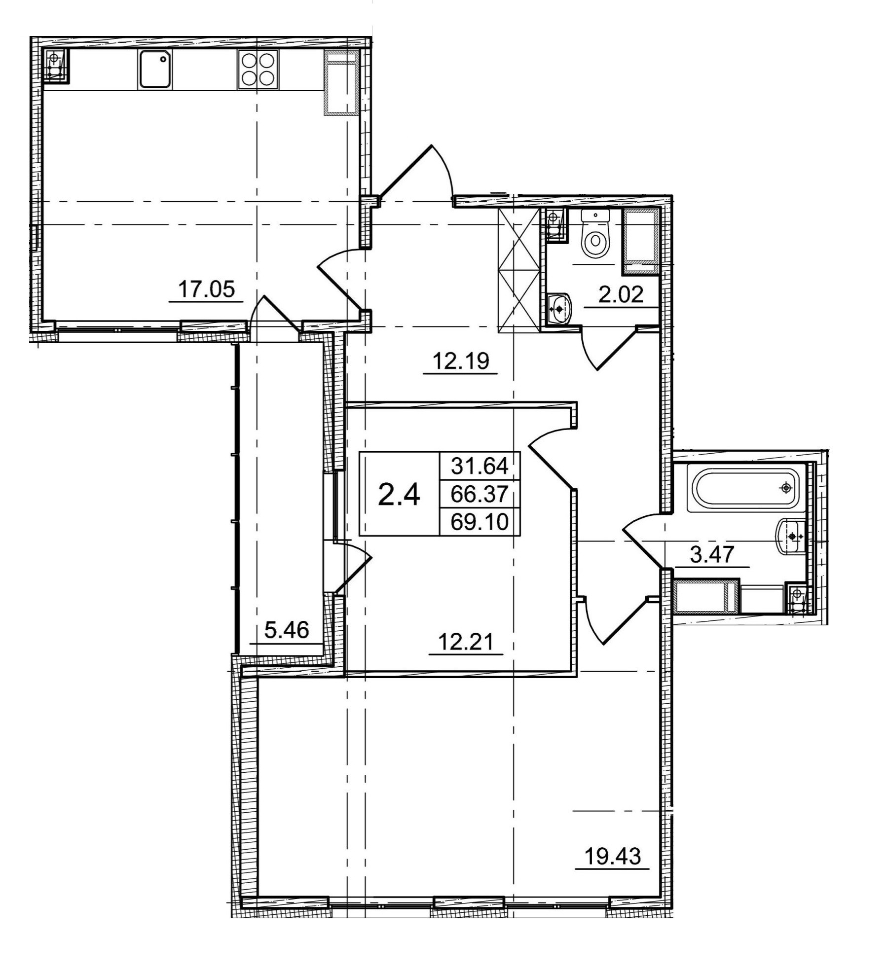 Комнаты – 19,43м2 +12,21м2