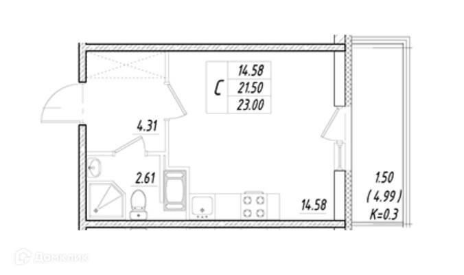Общая площадь 21.5 м2