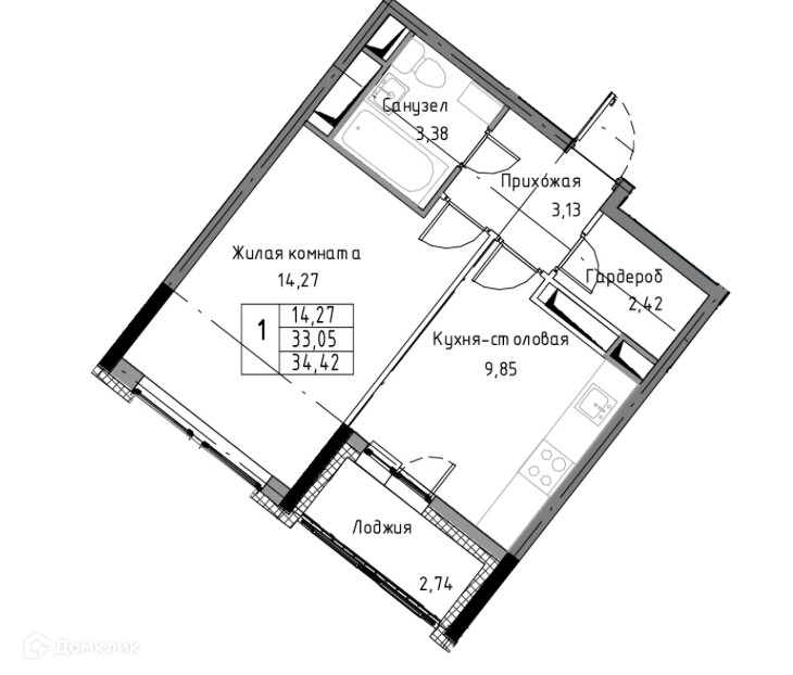 Общая площадь 33.05 м2