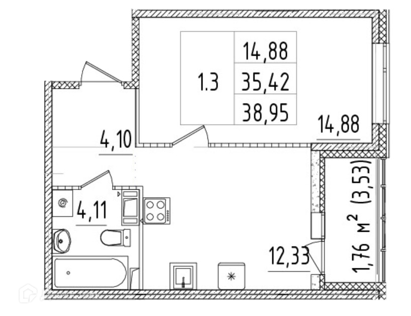 Общая площадь 35.42 м2