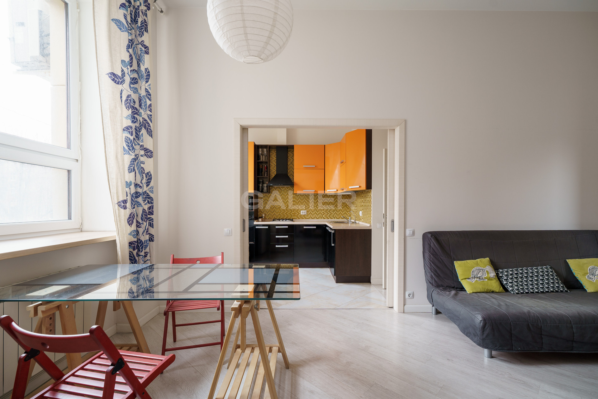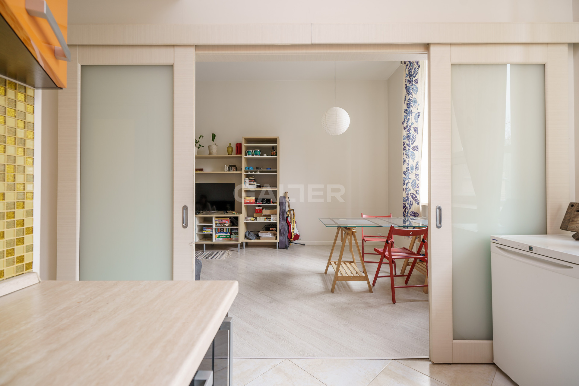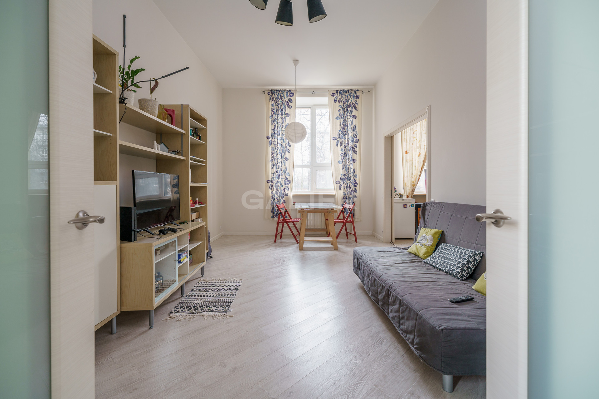 - Кухня 8м объединена с гостиной, но благодаря раздвижным дверям ее можно изолировать