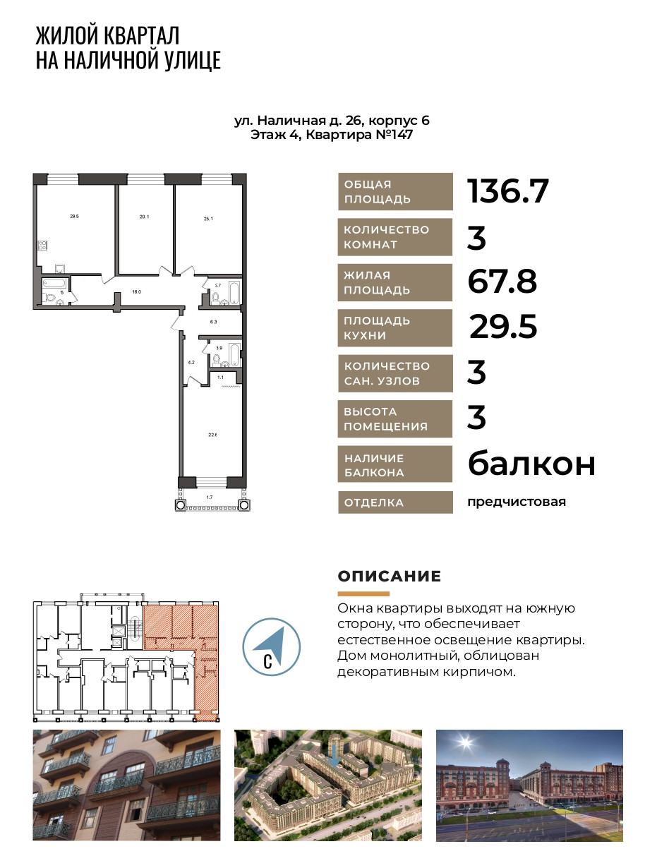3-комнатная квартира, 136.7 м2, этаж 4 / 11, на продажу в Санкт-Петербурге, Наличная улица, 26к6