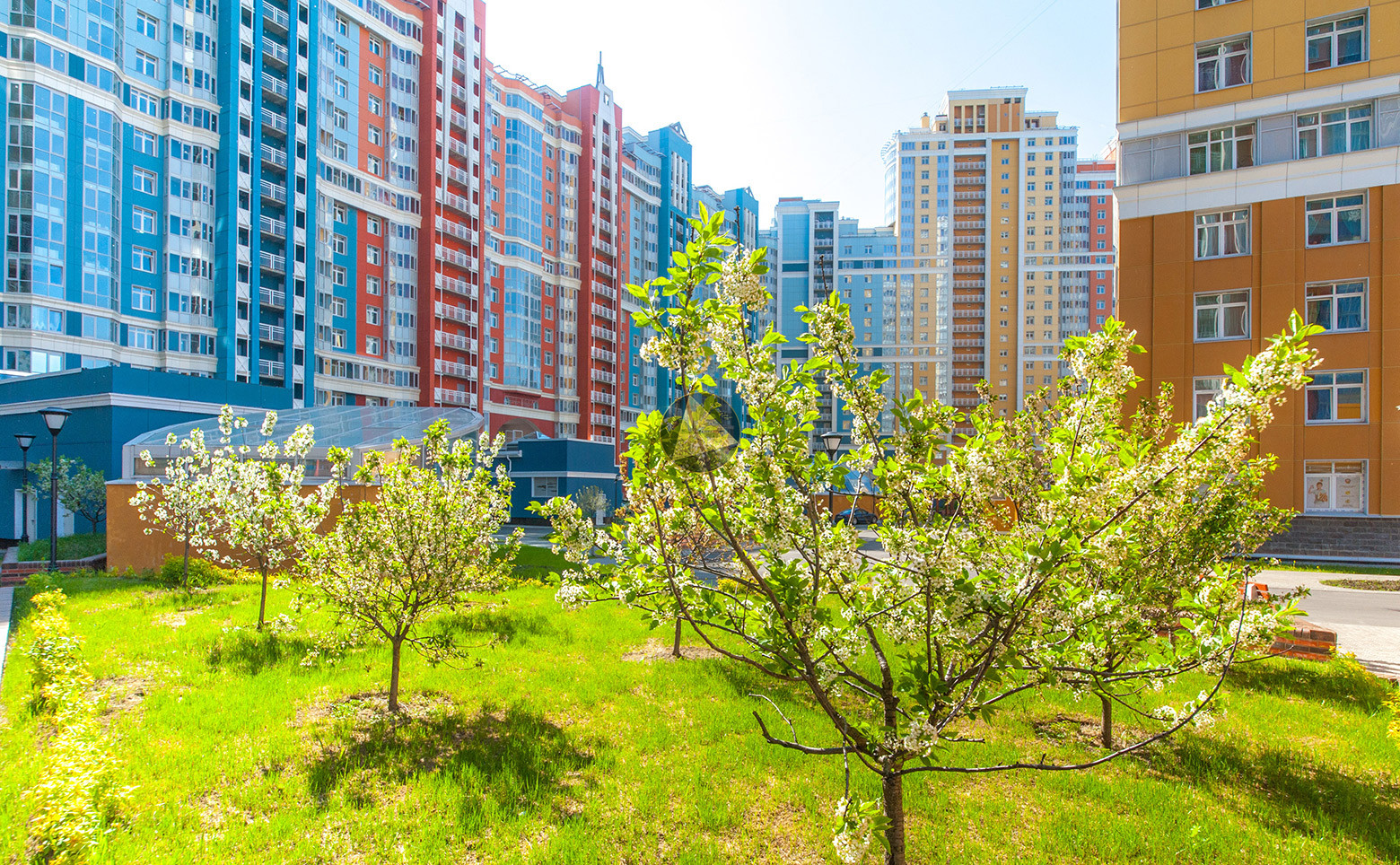 - Во дворе оборудованы детские площадки, зона отдыха, бассейн, проведено озеленение с клумбами и фонтанами. Для автовладельцев предусмотрен многоуровневый паркинг на  3959 мм.