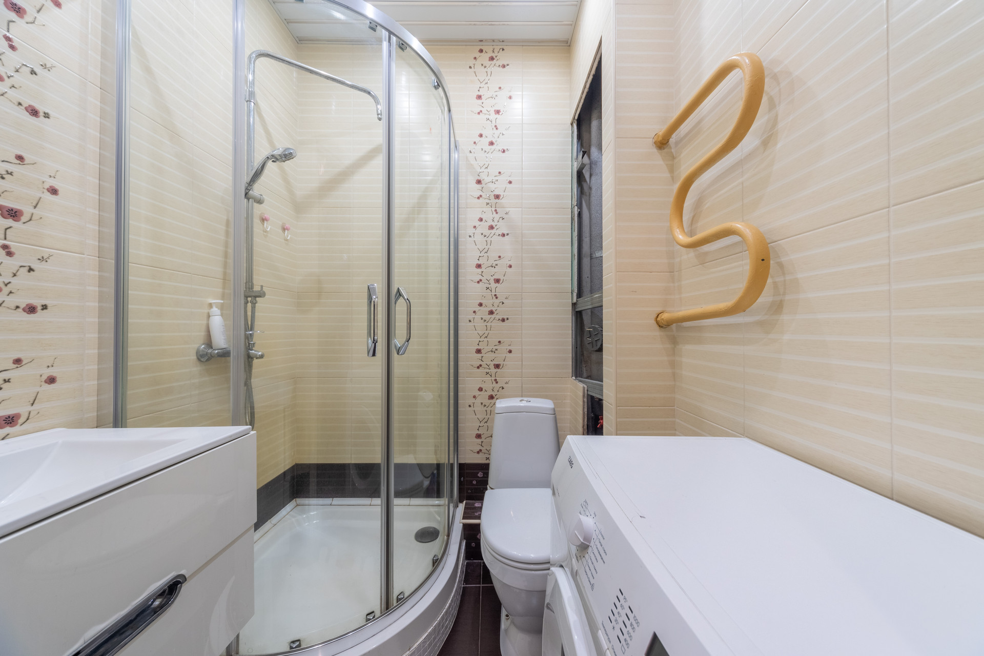 +  Совмещенный санузел 3,0 м2, где комфортно размещены : душевая кабина, широкая раковина с тумбой, унитаз и стиральная машина.