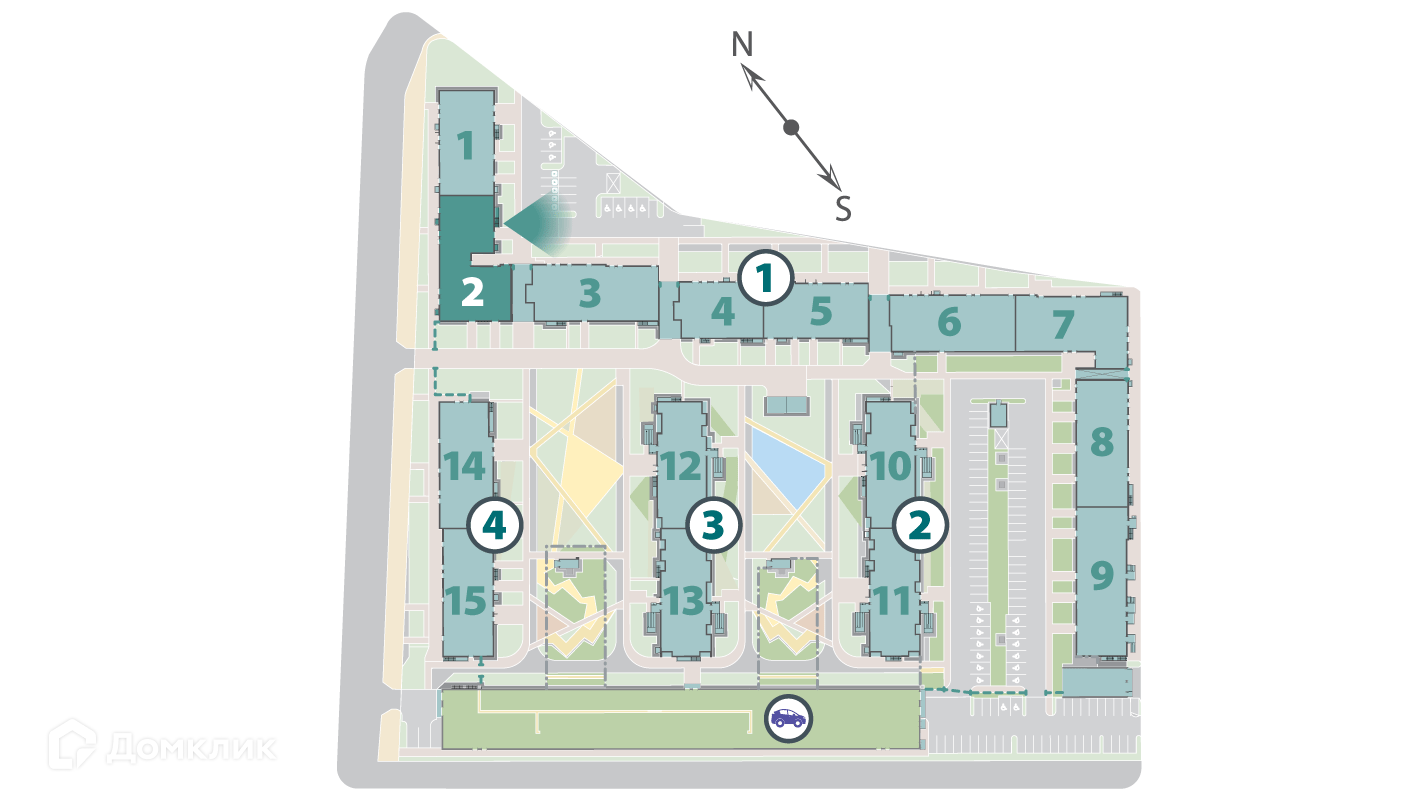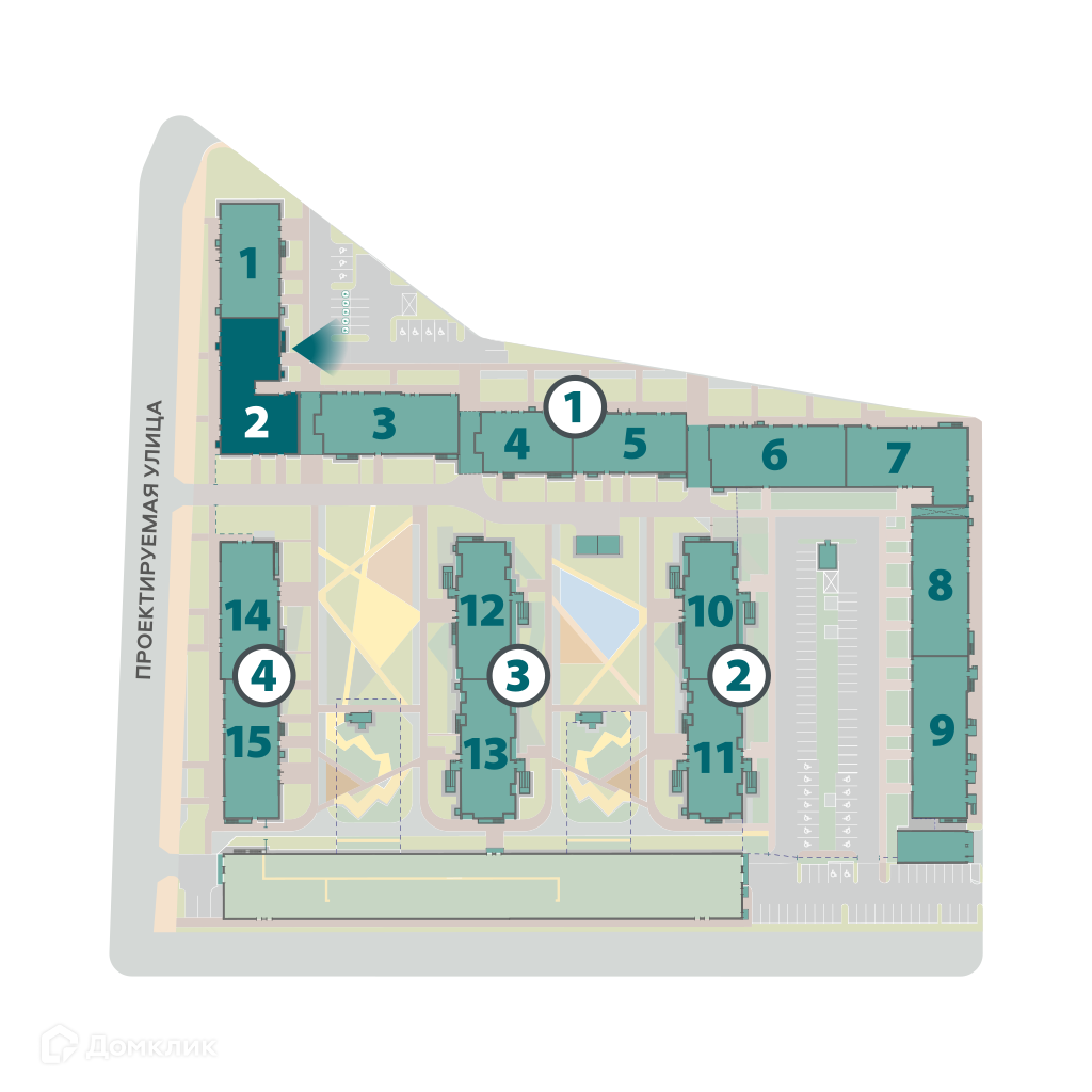 ЖК представляет собой 4 корпуса по 10-13 этажей. Корпуса расположены так, что образуют уютные безопасные дворы, при этом в них просторно и светло. Два многоуровневых паркинга вдоль улицы защищают дворы от городского шума.