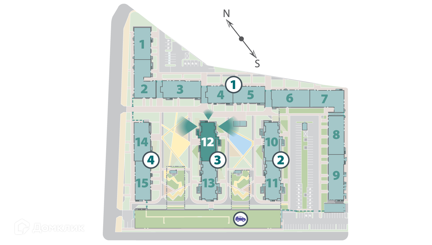 ЖК представляет собой 4 корпуса по 10-13 этажей. Корпуса расположены так, что образуют уютные безопасные дворы, при этом в них просторно и светло. Два многоуровневых паркинга вдоль улицы защищают дворы от городского шума.