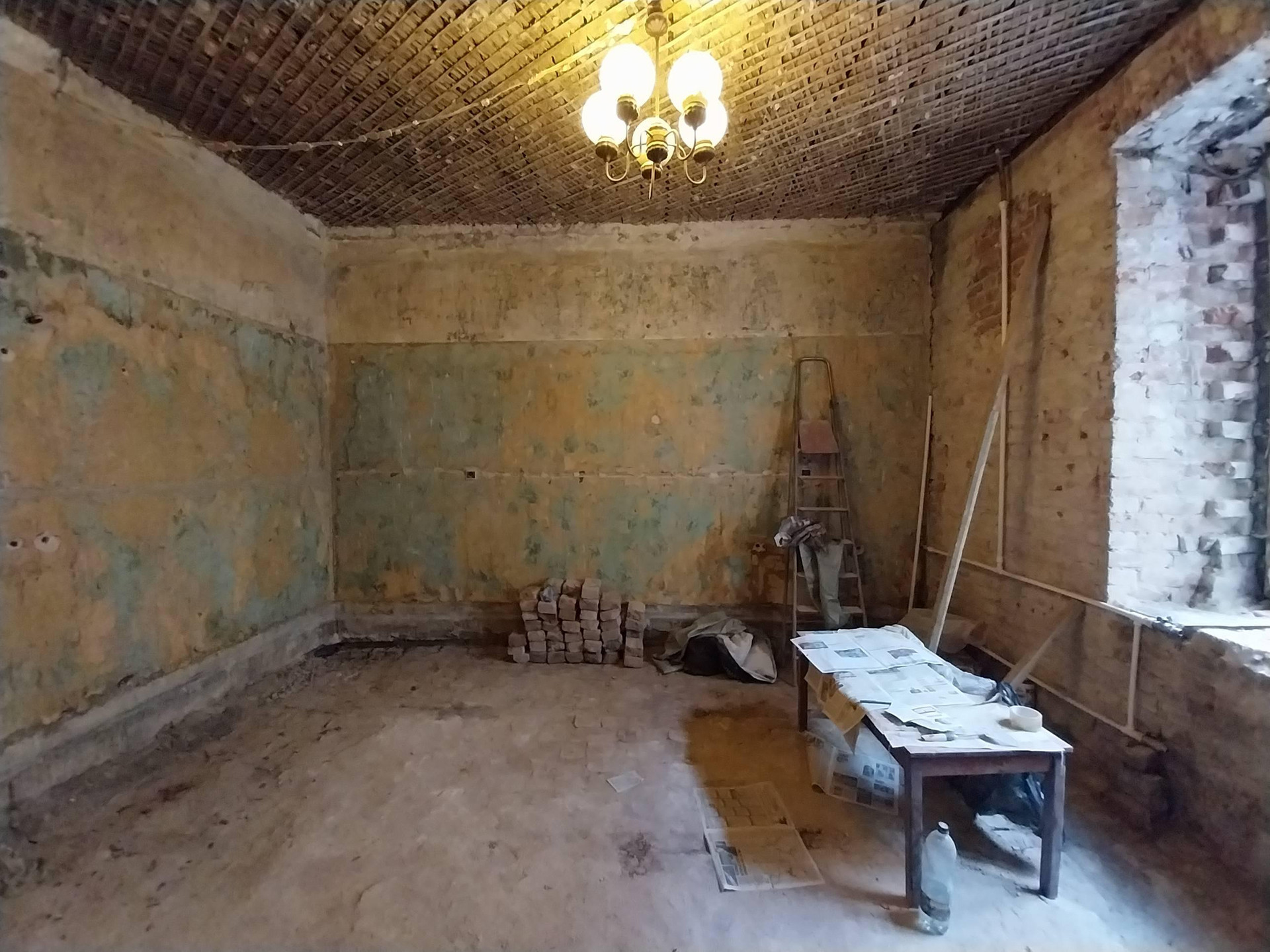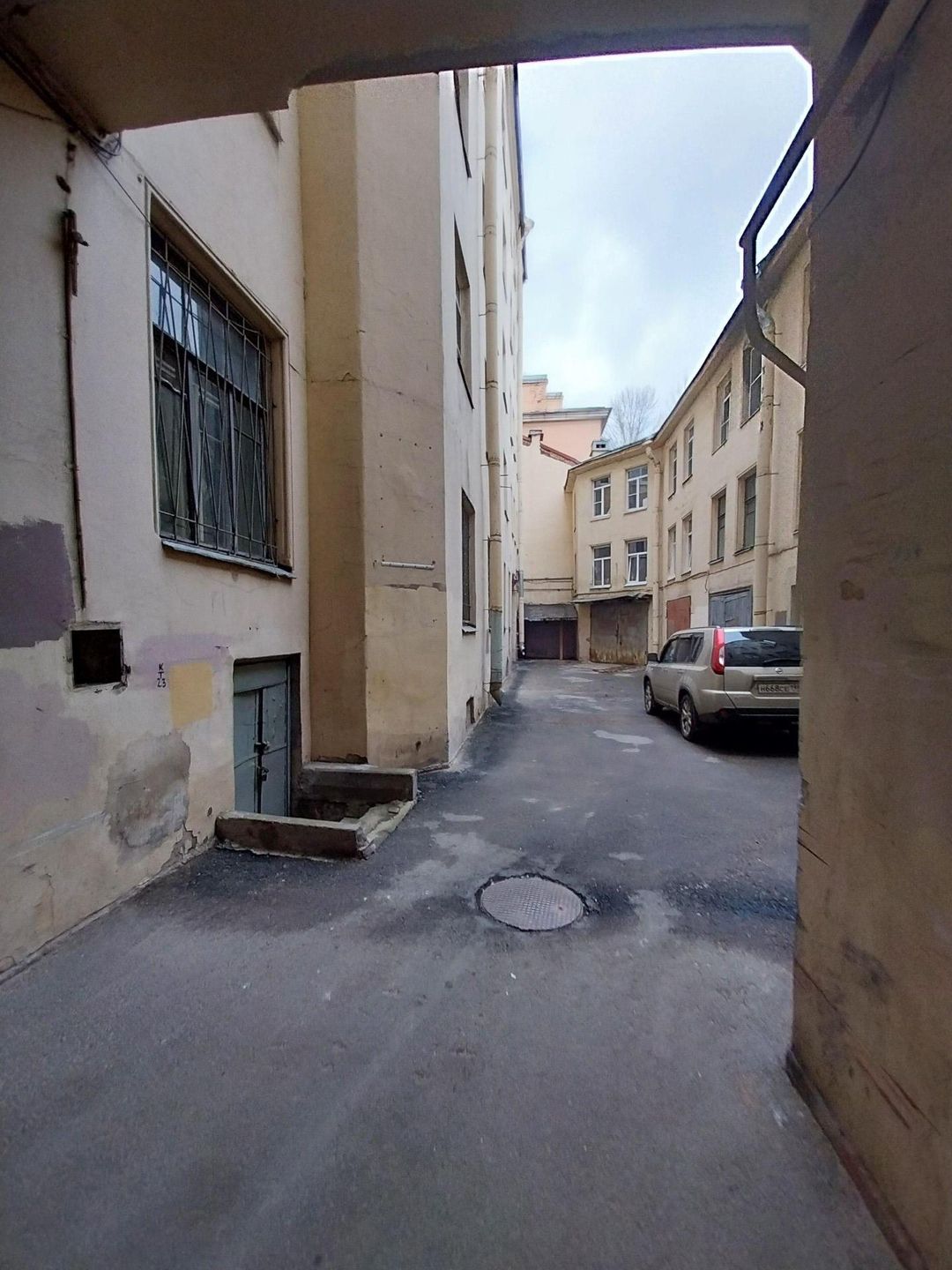 Высокий первый этаж, от земли до окон 1.7 метра. Окна выходят в закрытый двор. Высокие потолки 3.5 метра, позволяют сделать второй этаж. Планировка свободная.