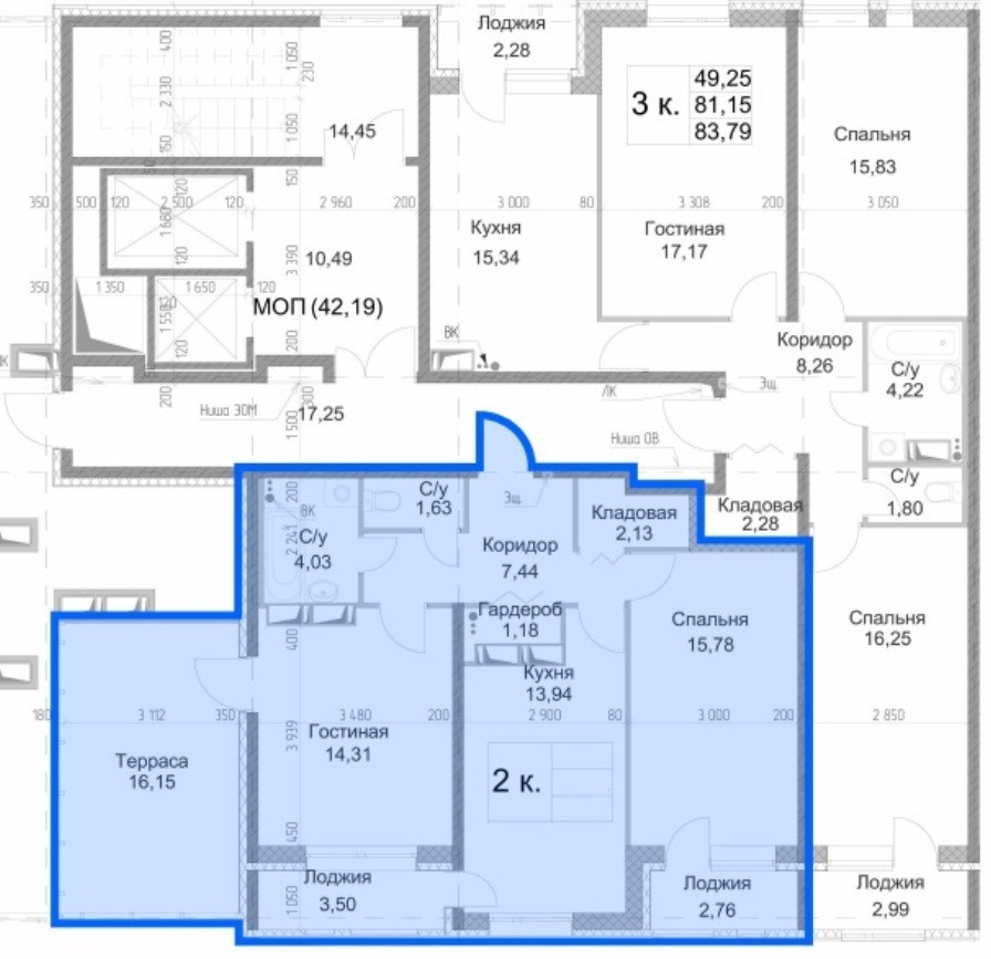 Лоджии – 3,50м2 + 2,76м2