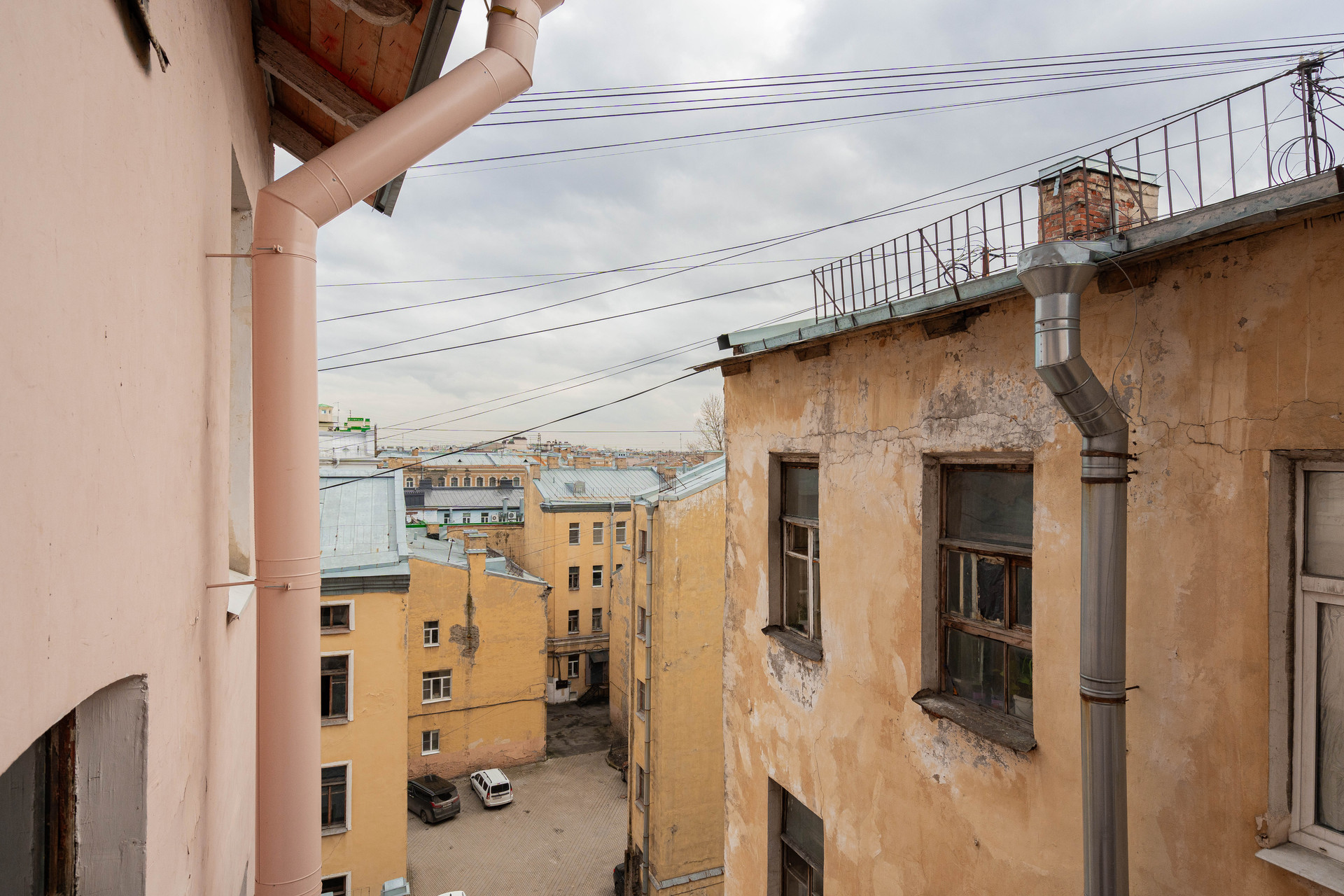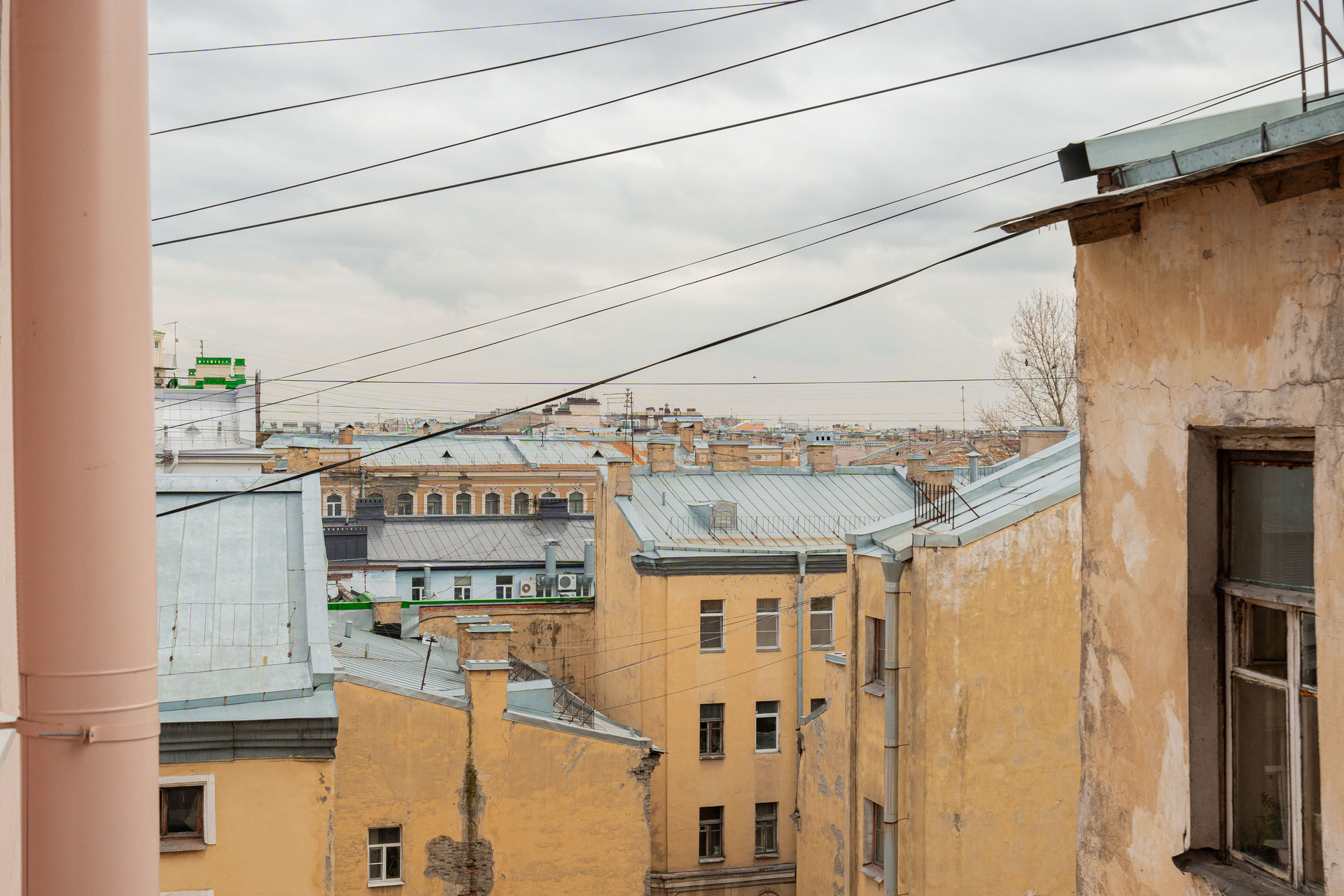 Окна выходят на улицу с видом на крыши Санкт-Петербурга и в тихий двор.