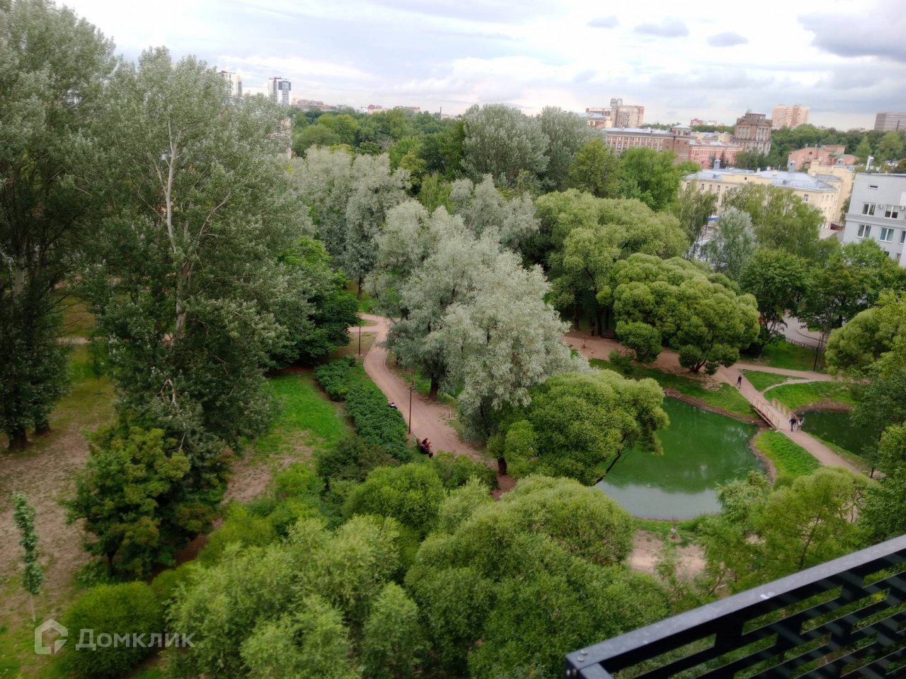 Вид  на три стороны дома. Основная часть окон входит на зеленый Пионерский сад с романтичным прудом.